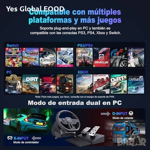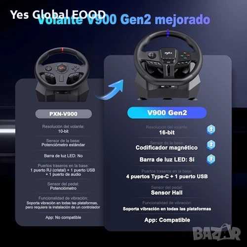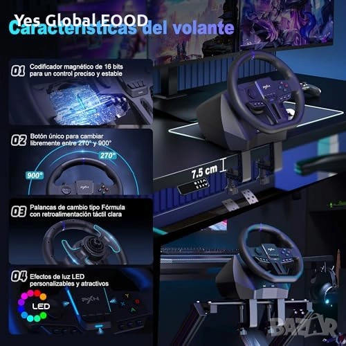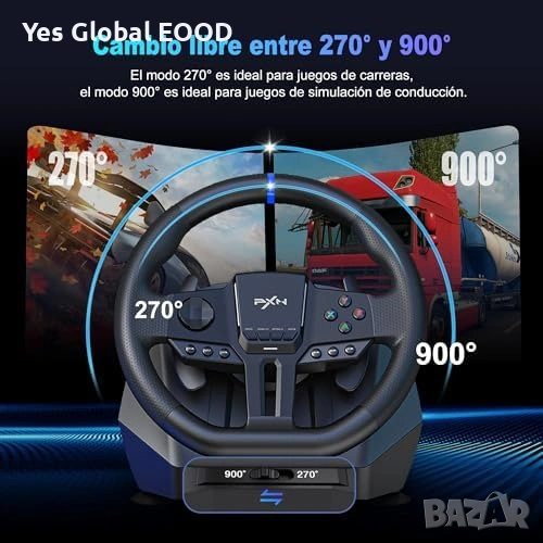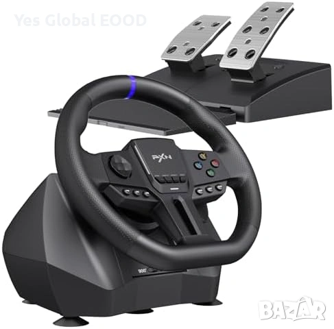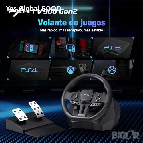 Геймърски състезателен волан PXN V900 Gen2 с педали, създаден за реалистично изживяване при автомобилни симулатори. Поддържа 270° и 900° режим на завъртане, което позволява използване както за аркадни, така и за симулационни игри.