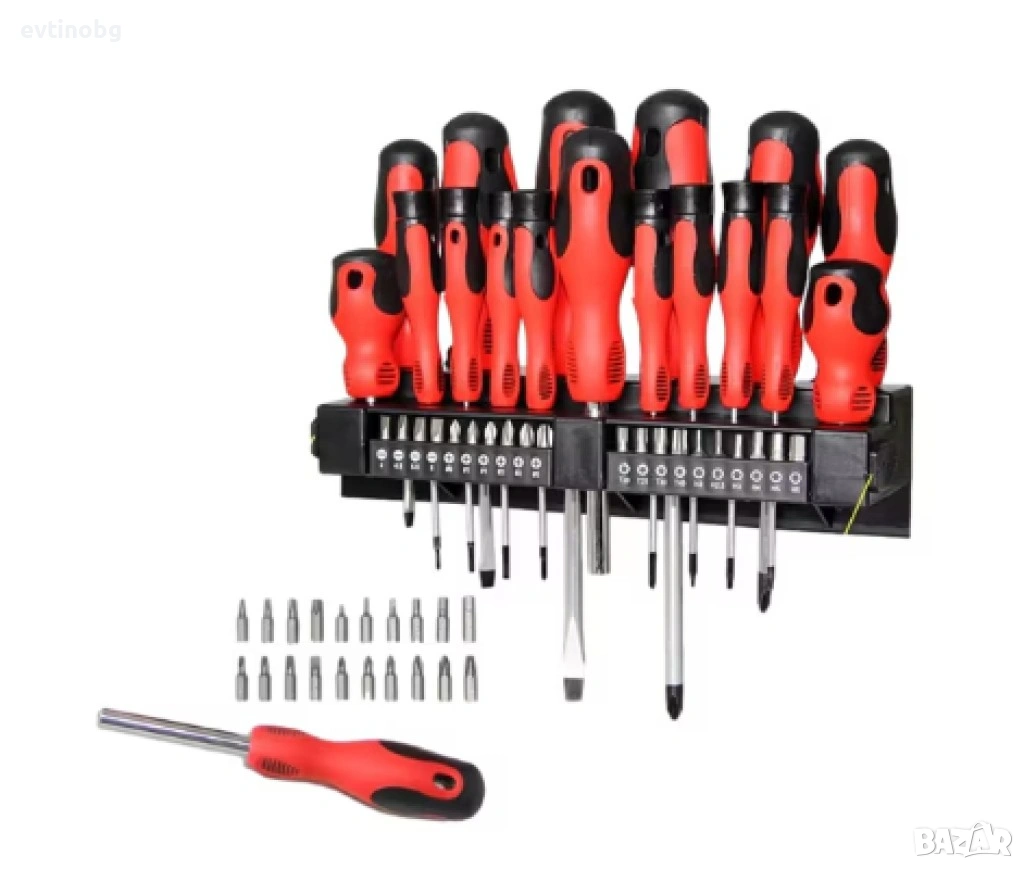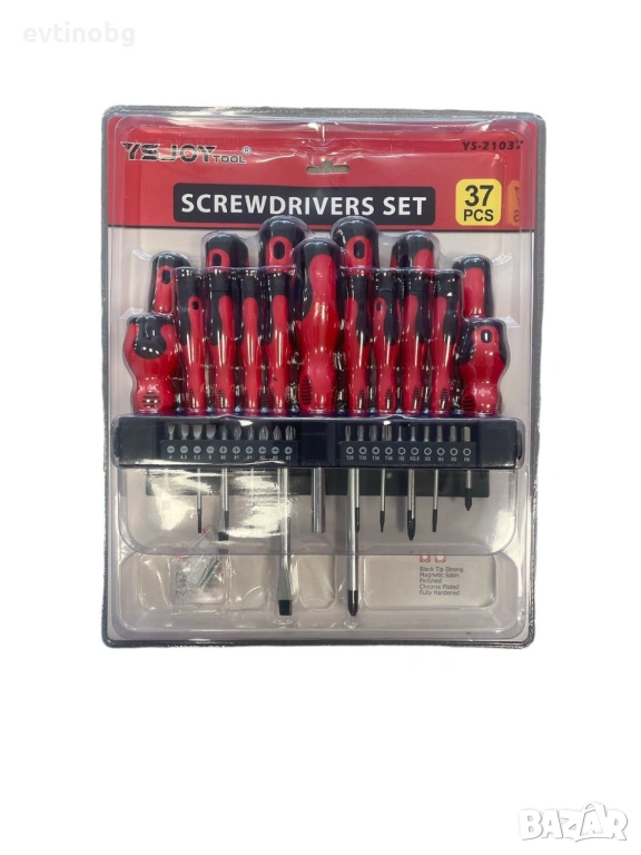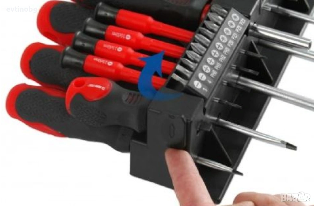 Брой части: 37; Материал: Хром-ванадиева стомана (CrV); Допълнителни характеристики: Магнитни върхове, ергономични дръжки, въртящи се глави на прецизните отвертки, специална тава за битове; Компактност и организация: Лесно сглобяване на закачалка с 4 отвора за монтаж; Тип отвертки: 8 x плоски и Phillips отвертки: 6x38 мм, 5x75 мм, 6x100 мм, 8x150 мм, PH2x38 мм, PH1x75 мм, PH2x100 мм, PH3x150 мм / 8 x прецизни отвертки: 2.0x50 мм, 2.5x50 мм, 3.0x50 мм, T9.50 мм, PH00x50 мм, PH0x50 мм, PH1x50 мм, T10x50 мм; Битове: 20 x 25 мм накрайници: 3-4-5-6-7 мм, PH0- PH1 -PH2 -PH3, T10, T15, T20, T25, T27, T30, T40, PZ-, PZ1- PZ2 -PZ3п; Битова отвертка: 1 бр.
