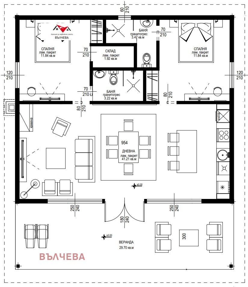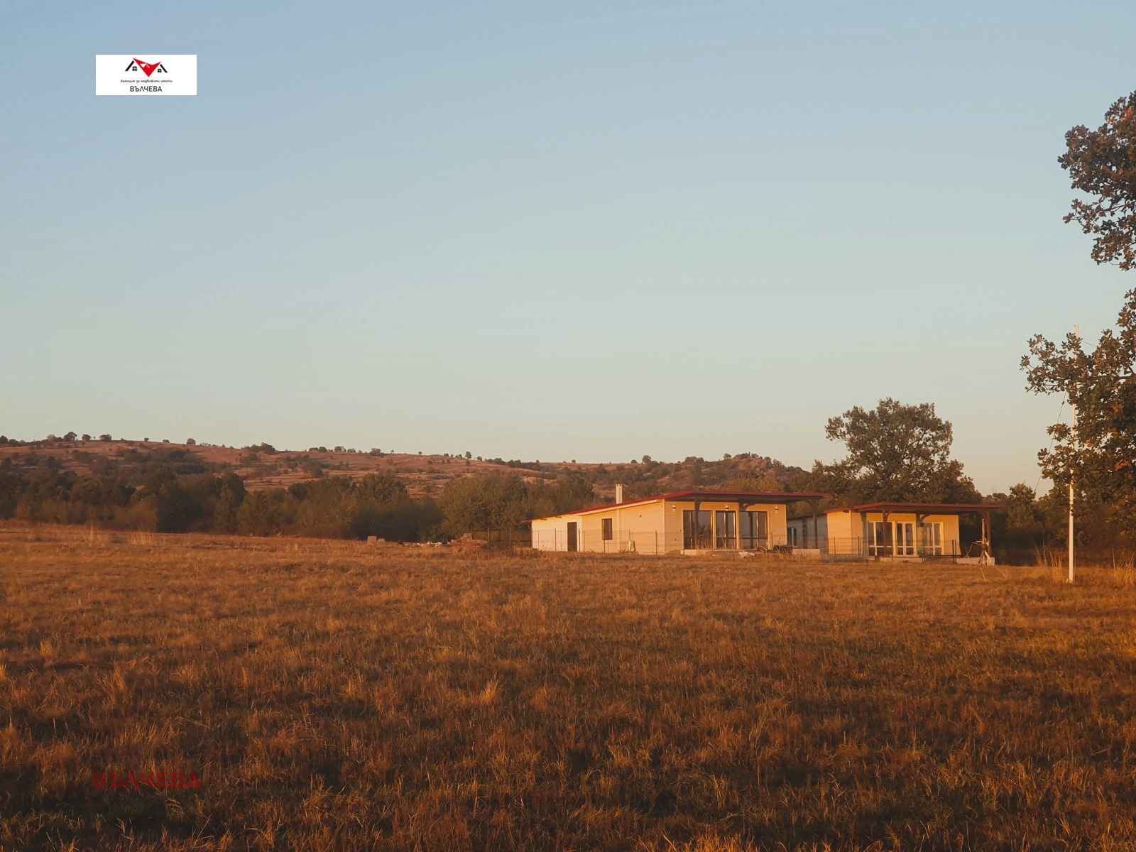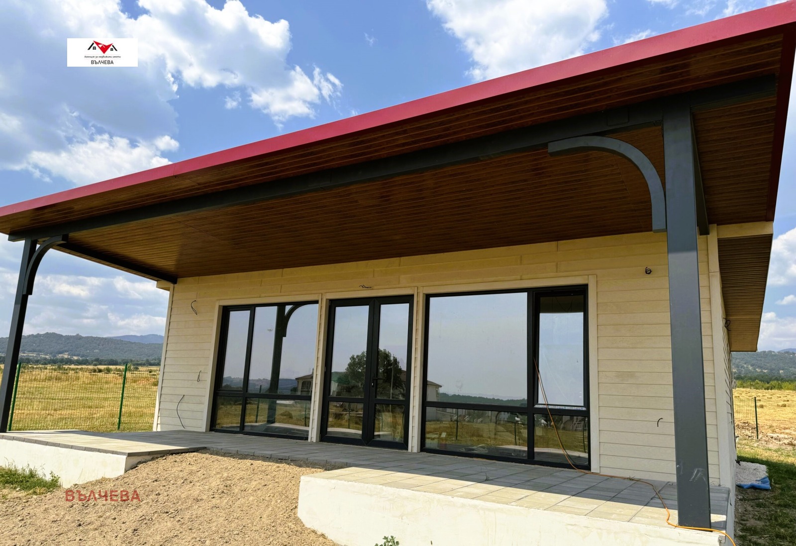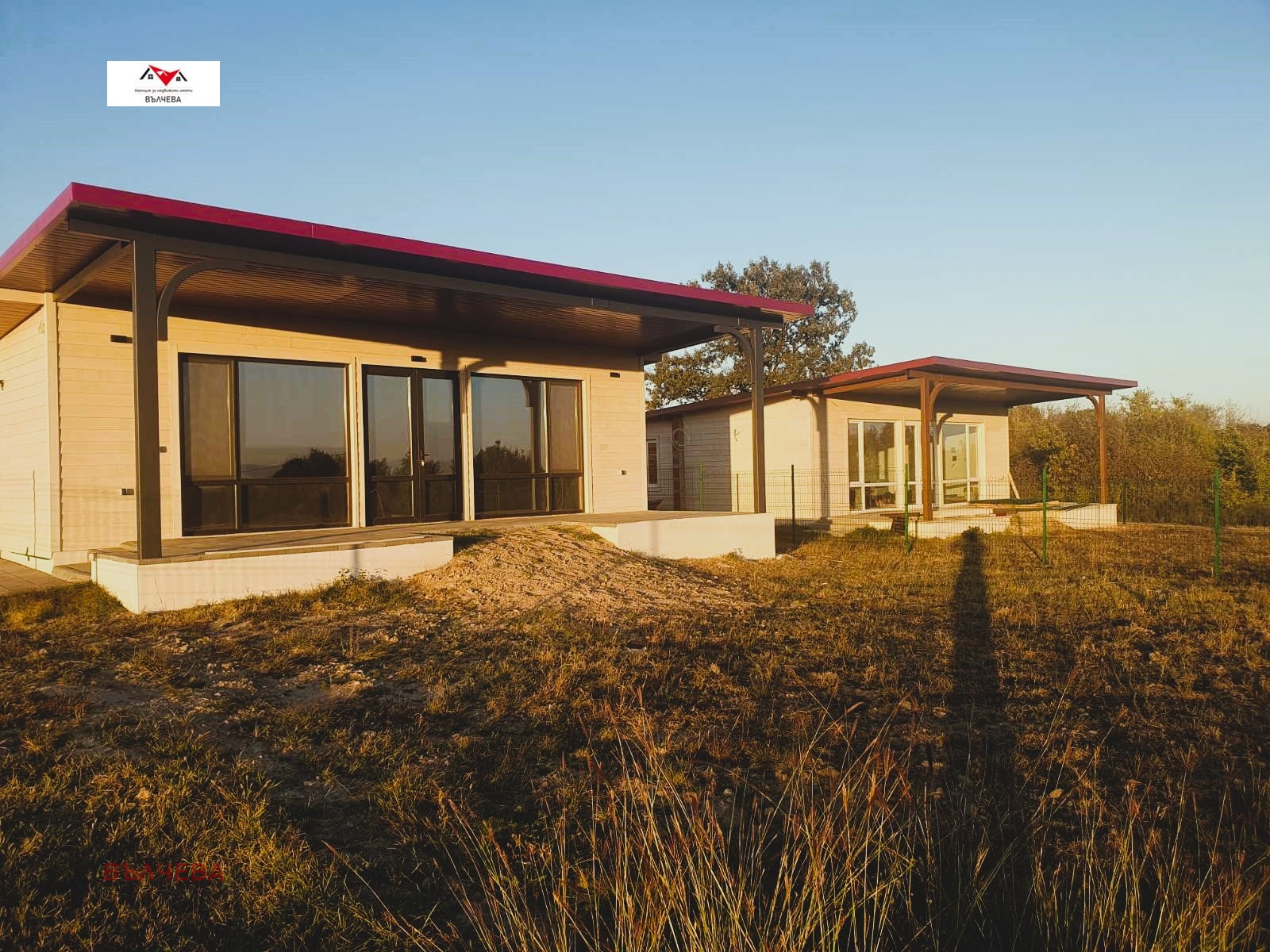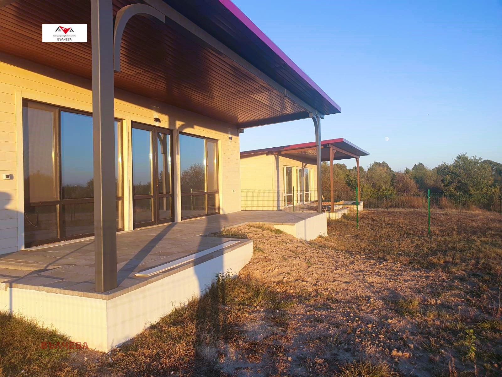 Степен на завършеност: Сградите се издават на шпакловка и замазка със завършена фасада, ажурна ограда, веранда облицована с външни плочки, изградени Ел. и ВиК инсталации, изпълнен комин за камина, мълниезащита на покрива като има възможност за монтиране на стойки за фотоволтаици (не са включени). Монолитна сграда - метална конструкция, покрив и стени - тип Сухо строителство (газобетон и термопанел), външни стени с двустранна топлоизолация, вътрешни двойни преградни стени, дограма ПВЦ -5 камерен 70мм профил с 2 мм армировка, немски механизми и стъклопакет с високо енергийно стъкло, декоративни облицовки на стрехи и фасада. Гарантирано качество на строителство с висок клас строителни материали от водещи европейски брандове.
