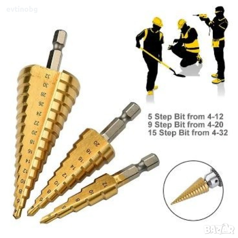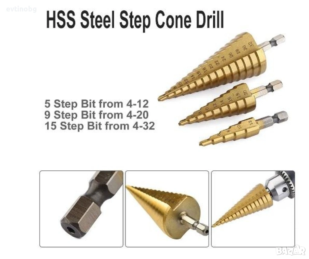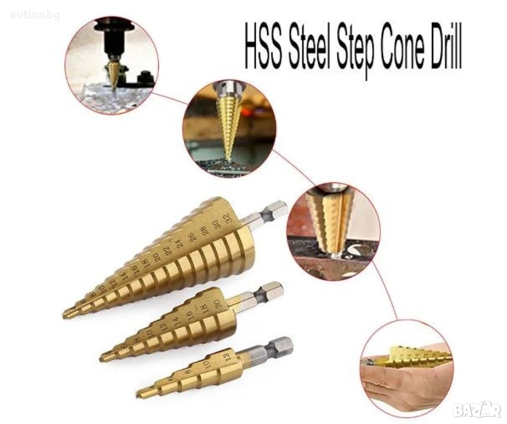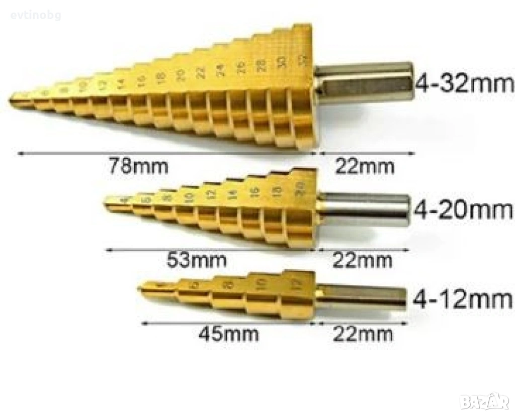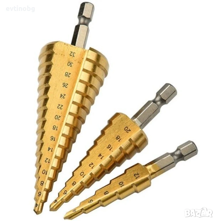 Комплект от стоманени стъпкови свредла, три броя, снимка 1 - Други инструменти - 53828876 Комплект от стоманени стъпкови свредла, три броя, снимка 2 - Други инструменти - 53828876 Комплект от стоманени стъпкови свредла, три броя, снимка 3 - Други инструменти - 53828876 Комплект от стоманени стъпкови свредла, три броя, снимка 4 - Други инструменти - 53828876 Комплект от стоманени стъпкови свредла, три броя, снимка 5 - Други инструменти - 53828876 Комплект от стоманени стъпкови свредла, три броя, снимка 6 - Други инструменти - 53828876 1/6