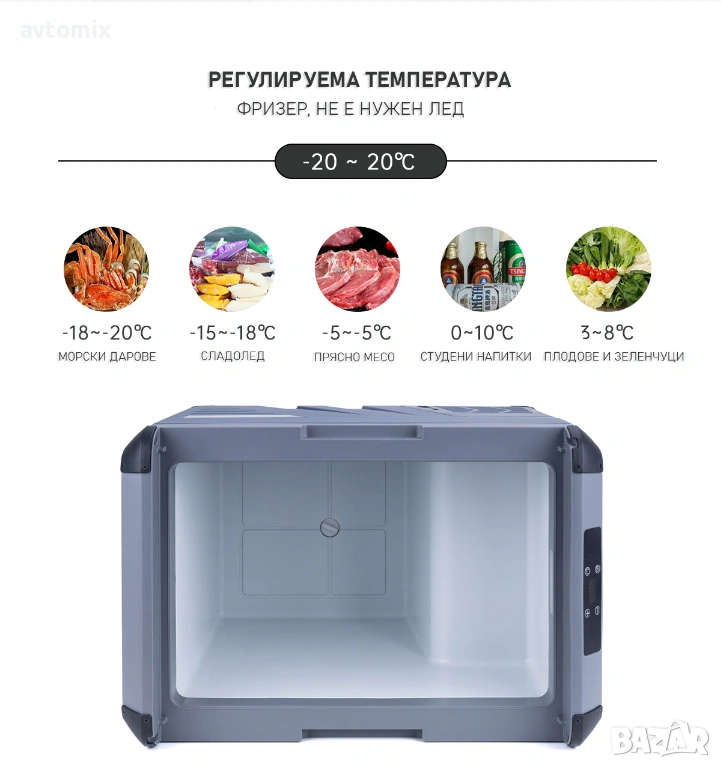 Фризер с двойна употреба: електрически компресорен хладилник и преносим къмпинг хладилник за автомобил. Подходящ за кемпер, къмпинг, риболов, барбекю и събития на открито. Универсален, с множество различни приложения за съхранение на храна и незаменимо удобство при продължително пътуване.