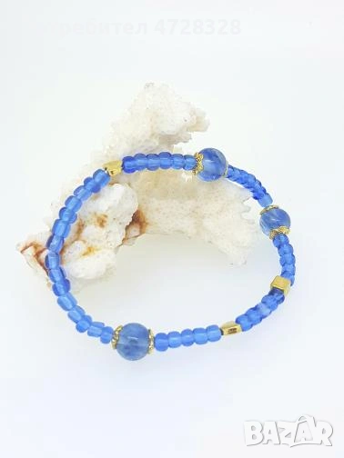 Гривна от сини чешки кристали и естествен камък син ахат нанизана на еластична ластикова корда с позлатени метални елементи.