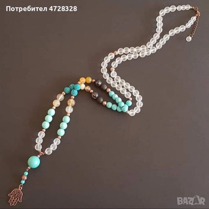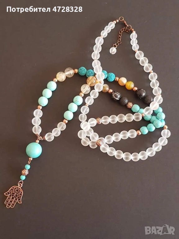 Елегантно колие от опушен бял кварц, тюркоаз, тюркоазен вулканичен камък, венерени коси, черен вулканичен камък и висулка Ръката на Фатима - символ на защита от зли очи, негативна енергия и уроки.Носи късмет здрав, щастие и благополучие.Петте пръста символизират петте елемента (огън, въздух, небе, земя, вода) и чакрите, които балансират тялото и предпазват от психологически и физически срив. Въпреки че е най-разпространен в исляма (свързан с дъщерята на Мохамед – Фатима), той е символ на защита и в юдаизма, християнството, будизма и индуизма.