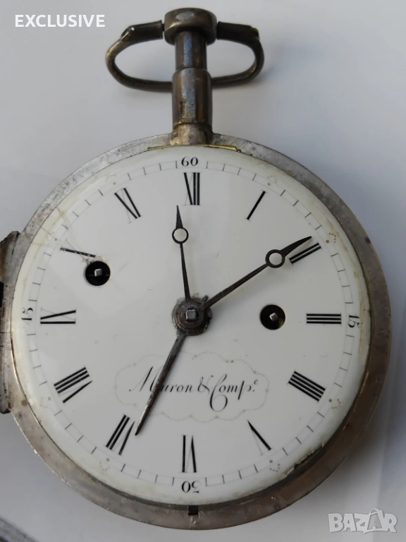 Бял емайлиран циферблат с римски цифри, подписан Meuron et Comp,