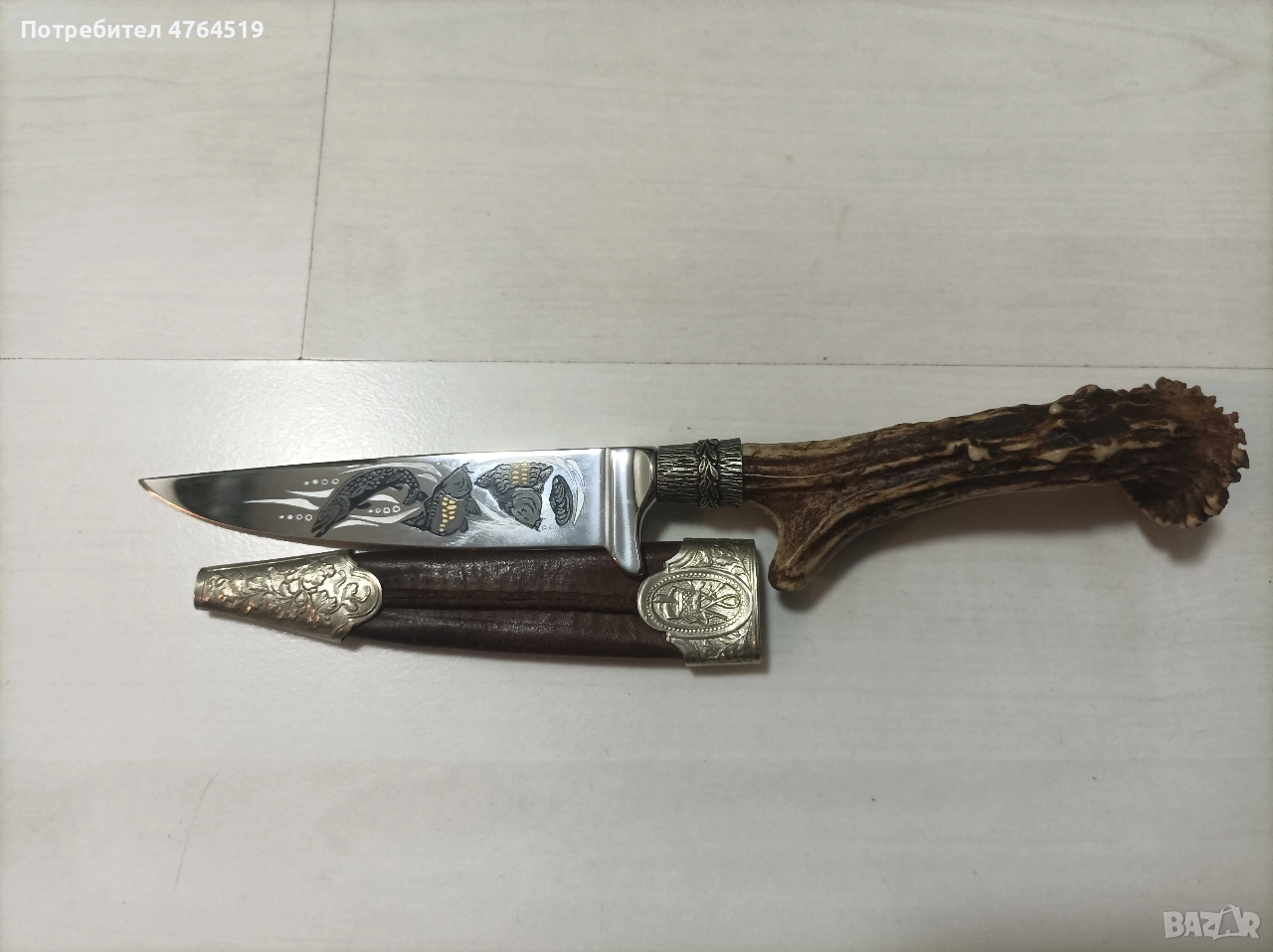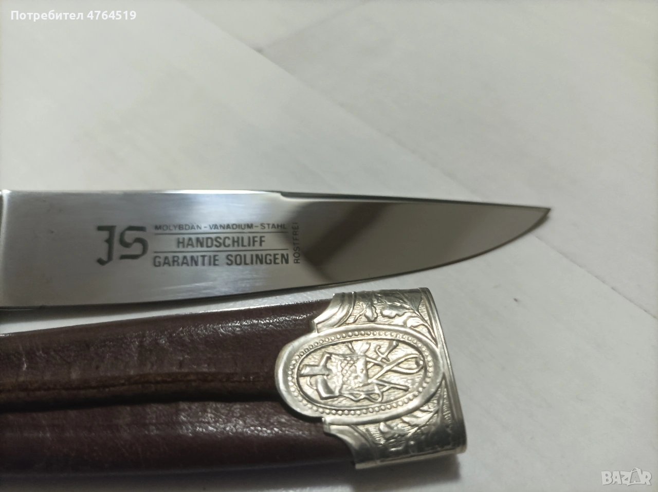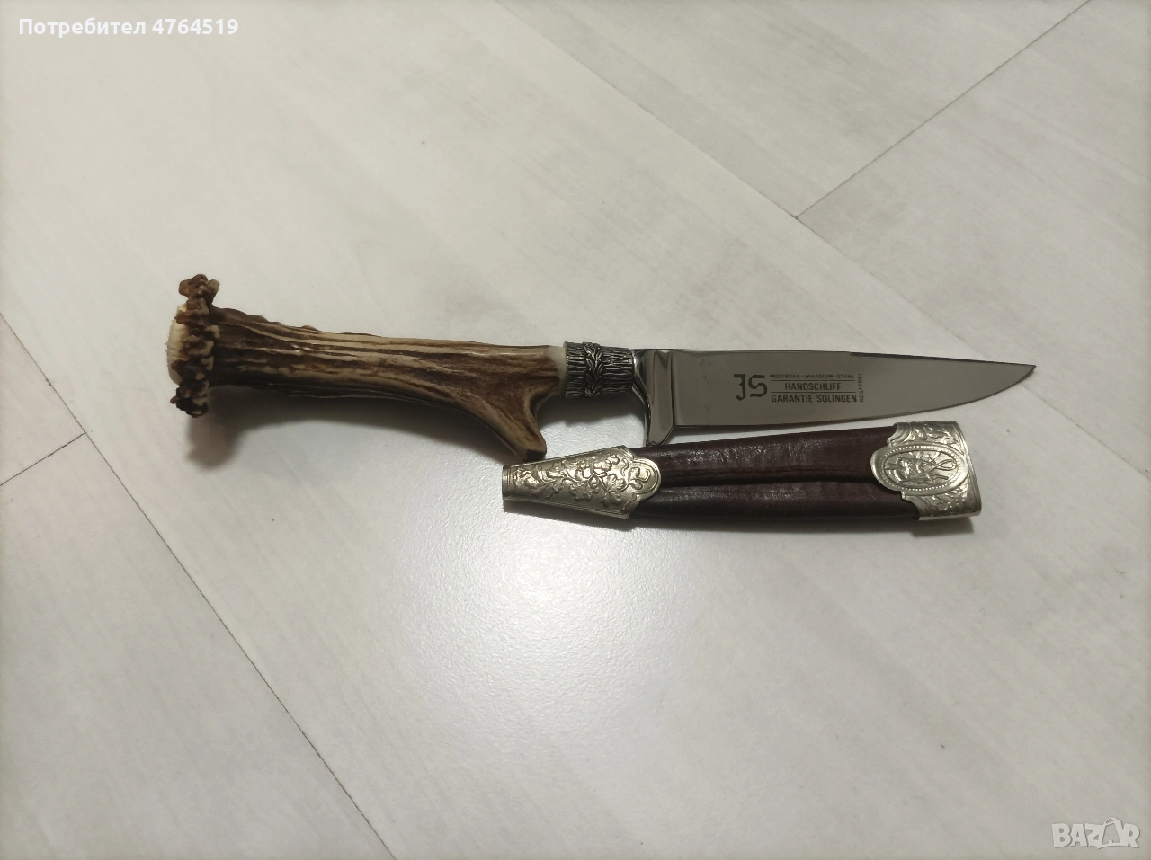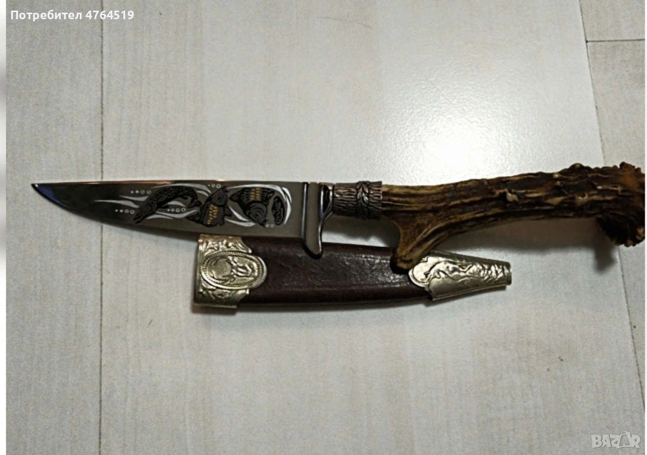 Описание: Продавам висококачествен ловен нож, произведен в световноизвестния център за хладно оръжие – Солинген, Германия. Ножът е в отлично състояние, съчетаващ традиционна изработка и първокласни материали. Идеален както за активни ловци и риболовци, така и за ценители и колекционери. Основни характеристики: Острие: Изработено от неръждаема молибден-ванадиева стомана (Molybdän-Vanadium-Stahl). Изключително здраво, корозоустойчиво и със сертифицирано ръчно заточване (Handschliff). Декорация: Уникална гравюра (ецване) на острието с мотив „Шарани“. Стилни метални обкови с релефни ловни мотиви (елен) на дръжката и канията. Дръжка: Масивен, автентичен еленски рог – придава отличен захват и класически вид. Произход: Маркировка "JS Garantie Solingen", гарантираща немско качество. Кания: Оригинална кожена кания с метален предпазител и обков. Състояние: Ножът е много добре запазен, с минимални следи от употреба. Острието е в оригиналния си блясък, без нащърбвания.