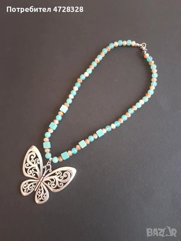 Изящтно колие от тюркоаз, корал и висулка посребрена пеперуда → Обява 53829664