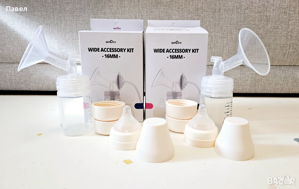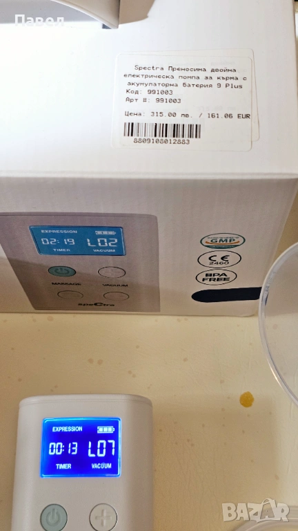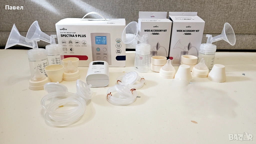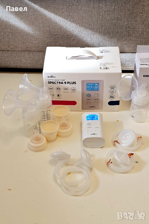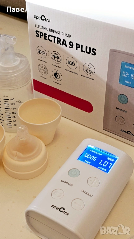 Продавам електрическа двойна помпа за кърма Spectra 9 PLUS с двоен комплект шишета и фунии с размери 28 мм и 16 мм. Компактна и тиха двойна помпа Spectra. Висока ефективност на изцеждането. Два режима: масаж (стимулация) и изцеждане.