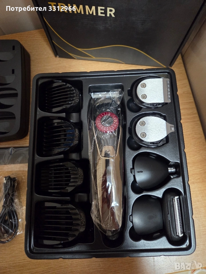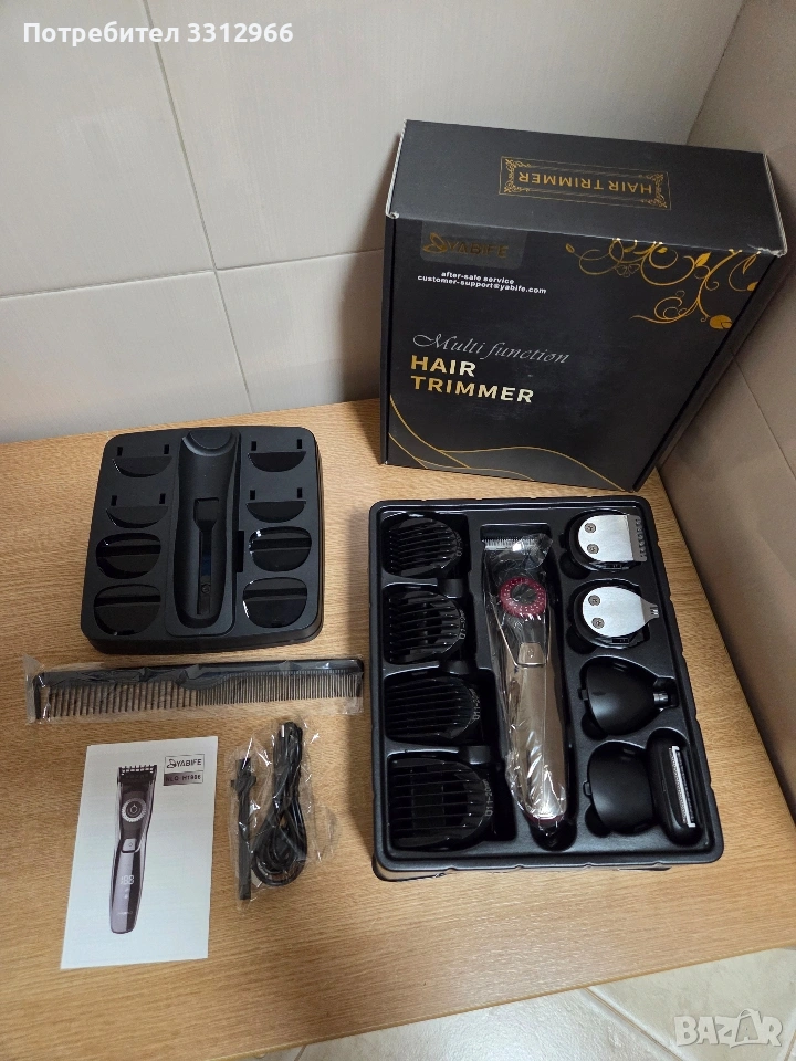 Чисто нова машинка за подстригване Yabife Включва множество приставки за подстригване на коса, брада, тяло и оформяне на детайли. Уредът е акумулаторен и се зарежда чрез USB кабел. Комплектът съдържа стойка за организиране на аксесоарите и гребен. Разполага с LED дисплей, показващ нивото на батерията.