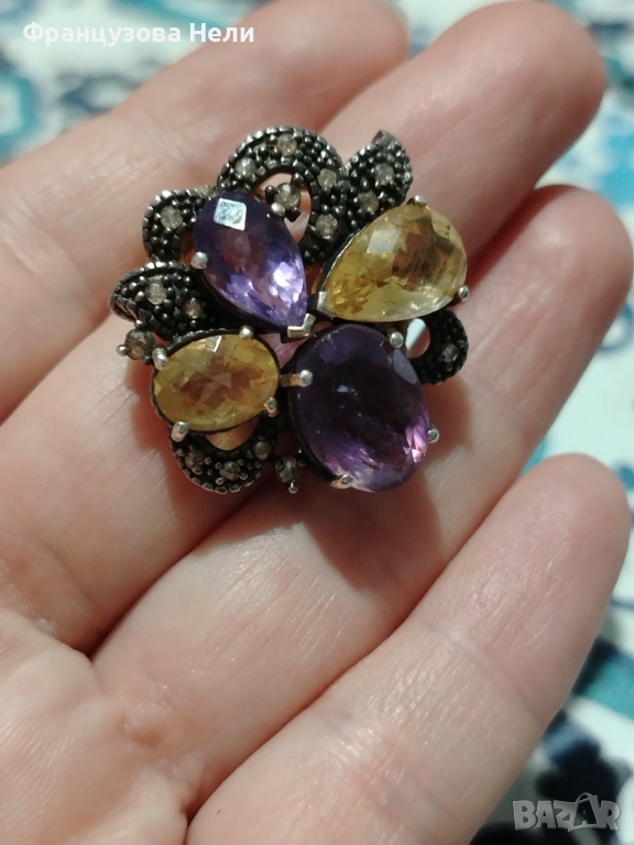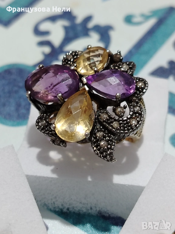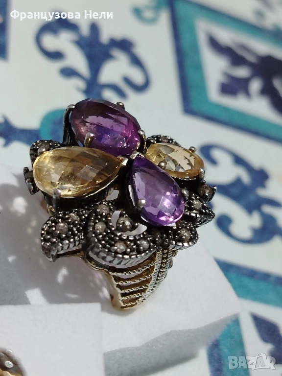 Масивен пръстен от злато 9 к , сребърна корона, аметисти,цитрини и диаманти.