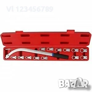 Ключ за разглобяване на обтегачите със сменяеми накрайници и огъната дръжка. Комплектът включва 13 бр TORX и пръстеновидни клеми в популярни размери.