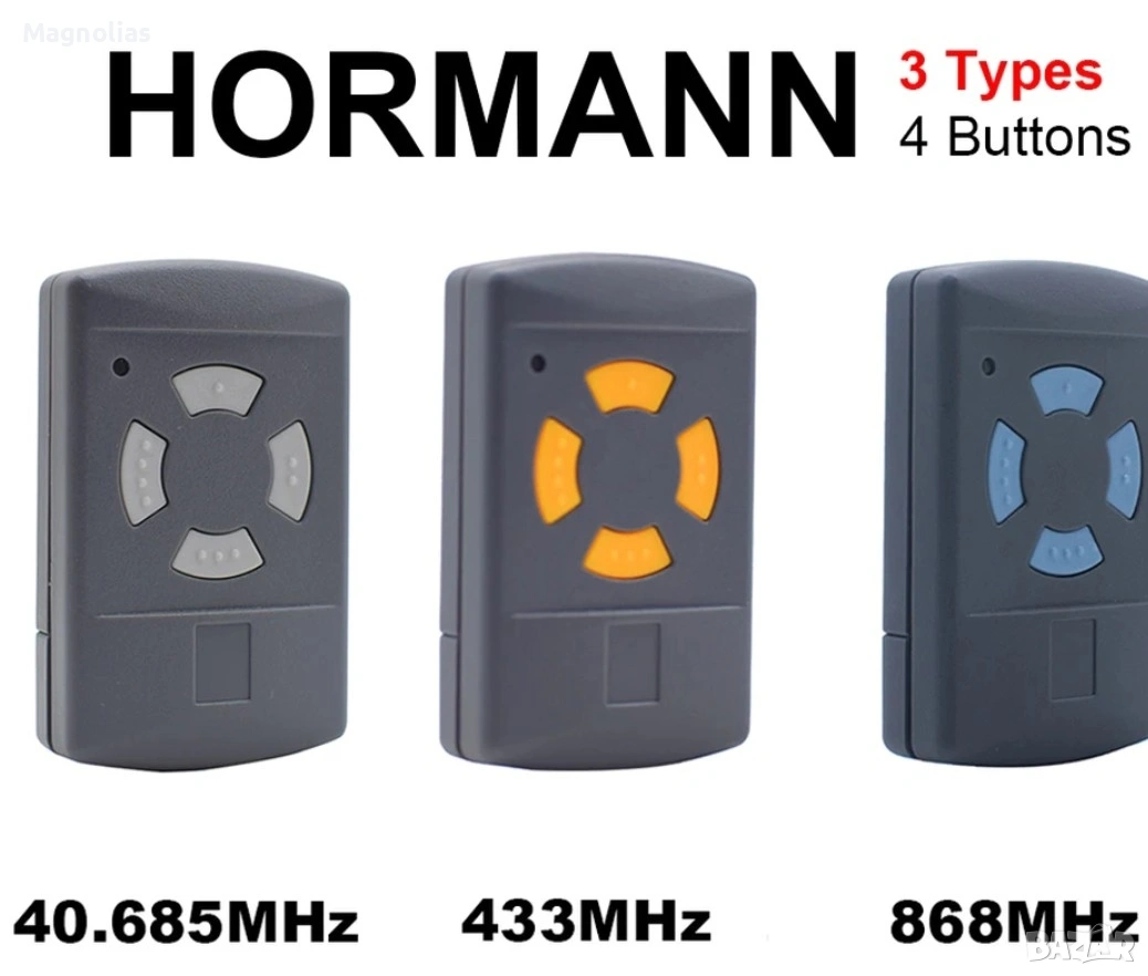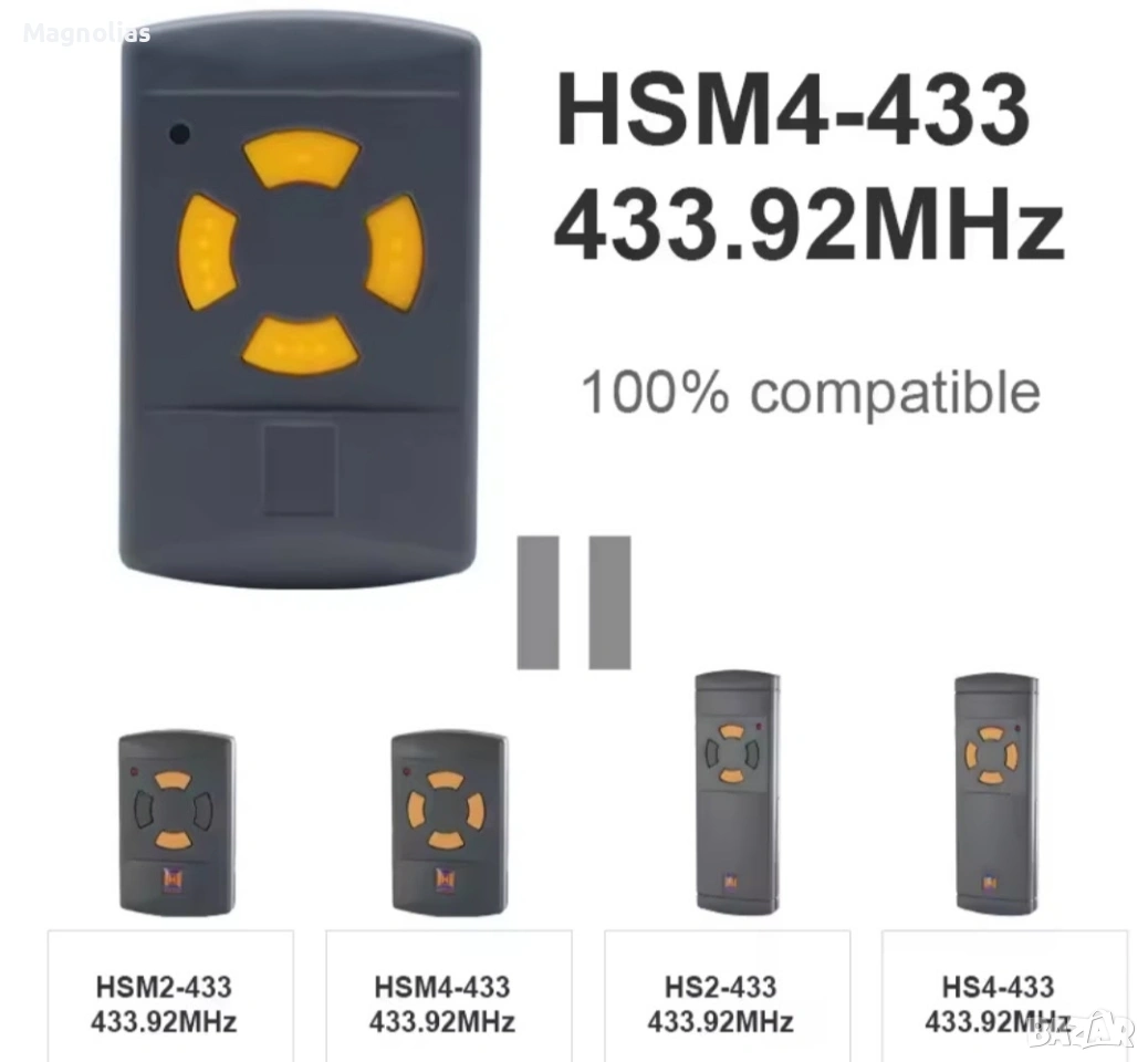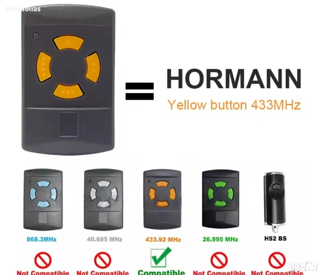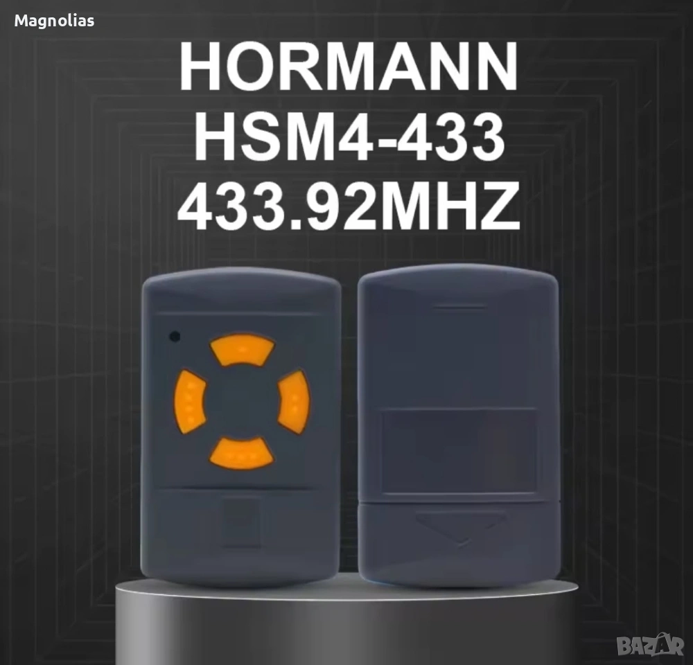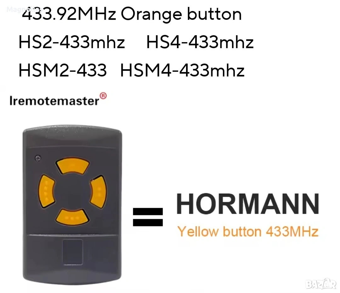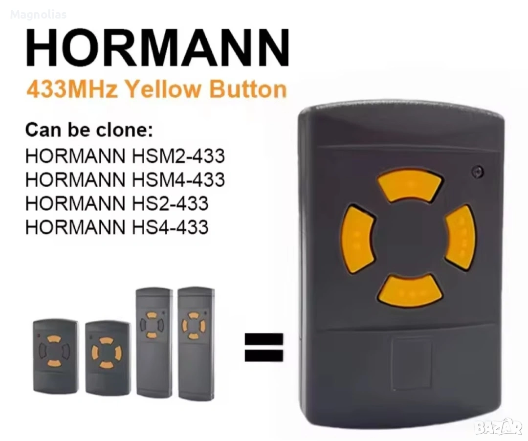Ръчен предавател Hörmann HSM 4, 433 MHz за задвижвания с приемник с фиксиран код Hörmann 433 MHz 4-бутонен мини ръчен предавател за макс. 4 задвижвания/функции не е подходящ за 433 MHz Rolling Code или 433 MHz BiSecur Тъмносив корпус с оранжеви клавиши Норман Цената включва ДДС плюс разходи за доставка Време за доставка 1-3 работни дни Описание Ръчният предавател Hоrmann HSM 4 с оранжеви бутони осигурява управление на по-стари модели гаражни врати Описание на ръчния предавател Hörmann HSM 4, 433,92 MHz Ръчният предавател Hörmann HSM 4 с оранжеви бутони осигурява удобно управление на по-стари гаражни врати, използващи радиочестота 433,92 MHz. Четирите функционални бутона позволяват управлението на допълнителни функции или допълнителни отварящи устройства. Обхват на доставката 1 Hоrmann HSM 4, честотен диапазон: 433,92 MHz Батерия: 12V, L1028, тип 23A Моля, обърнете внимание: Не е съвместимо с 433 MHz RC (Rolling Code) и 433 MHz BiSecur! Ръчните предаватели Hоrmann не са съвместими с продукти на трети страни и работят само с гаражни врати Hоrmann. Кодирането на HSM 4 е самообучащо се и може лесно да се наследи от съществуващия ръчен предавател. При избора на правилния ръчен предавател, честотният диапазон е от решаващо значение и трябва да се определи въз основа на цвета на бутона. Предлаганият тук ръчен предавател HSM 4, с честота 433,92 MHz