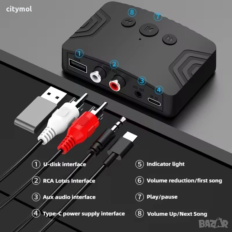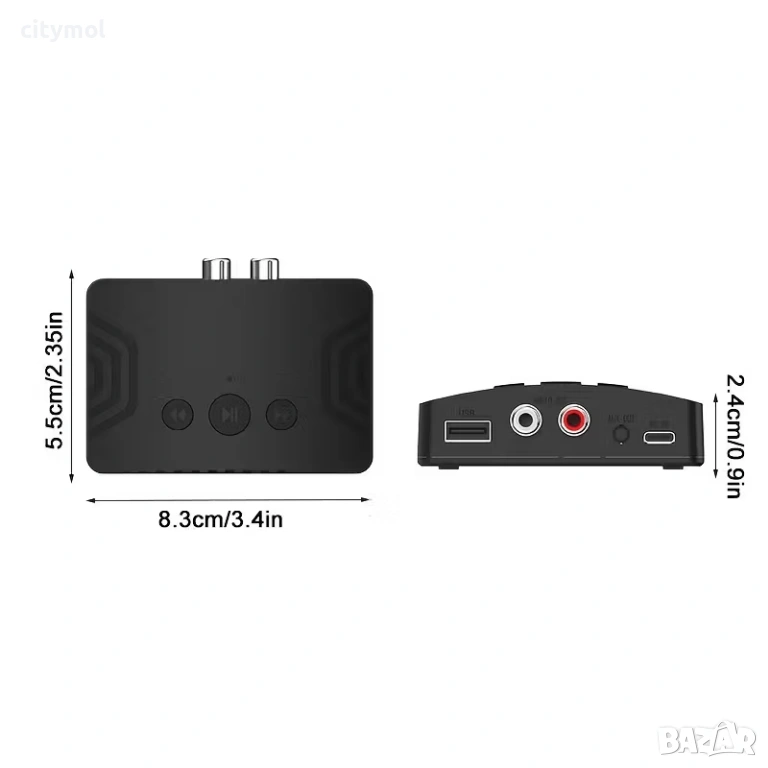 - Интерфейси: RCA L/R, AUX 3.5mm, USB (за флашка), Type-C (захранване)