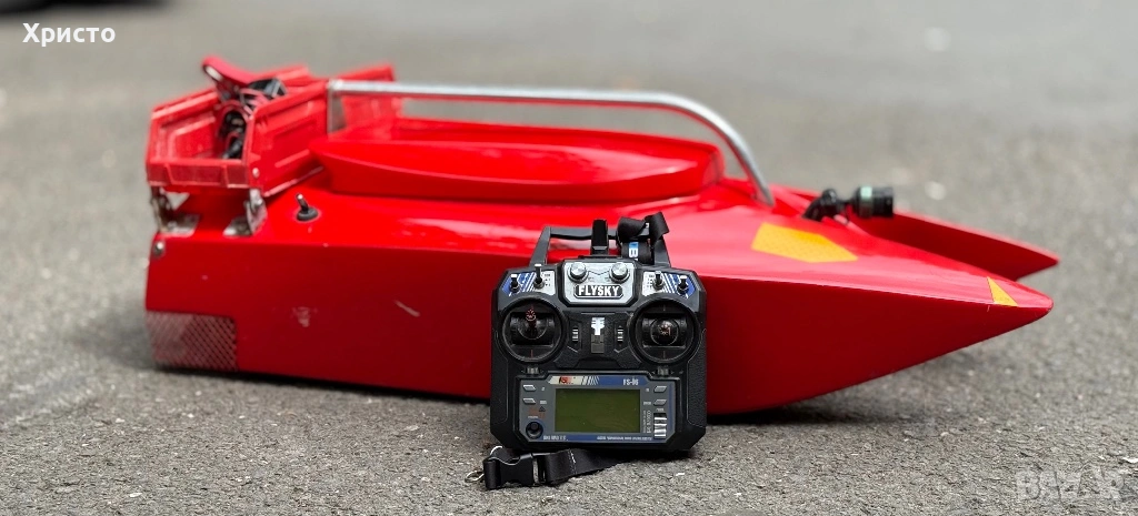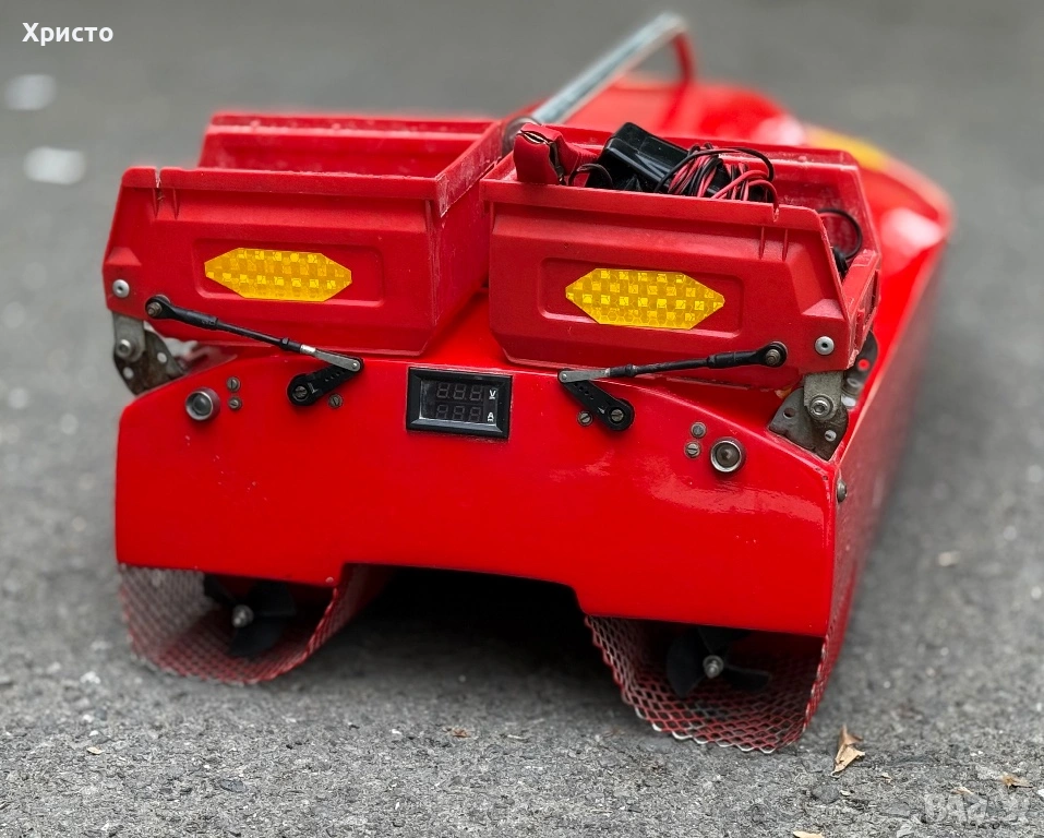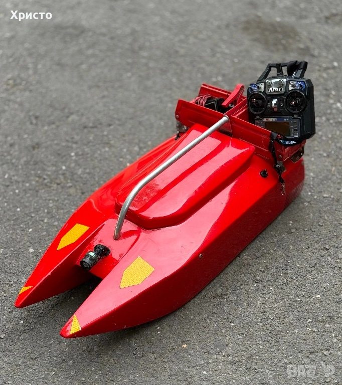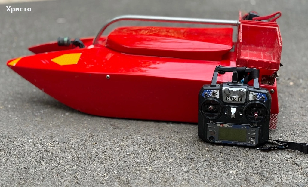 RC лодка за риболов (Bait Boat) с професионално дистанционно управление FlySky FS-i6. Лодката е в много добро състояние, напълно изправна и работи отлично. Всички функции работят безупречно – двигатели, бункери за захранка, управление и осветление. Лодката е катамаранен тип корпус, което я прави много стабилна във водата и подходяща за разпъване на монтаж и захранка при шаранджийски риболов. Оборудвана е с два електрически двигателя и двойни пропелери, които осигуряват плавно и стабилно движение. Пропелерите са защитени с метални решетки. Разполага с два дистанционно отварящи се контейнера за захранка, в които може да се поставят царевица, пелети, топчета или монтаж. Капацитетът е около 1 – 1.5 кг. Дистанционното управление FlySky FS-i6 е професионално, с обхват приблизително 300 – 500 метра при нормални условия, което позволява прецизно управление и разпъване на монтажа на голяма дистанция.