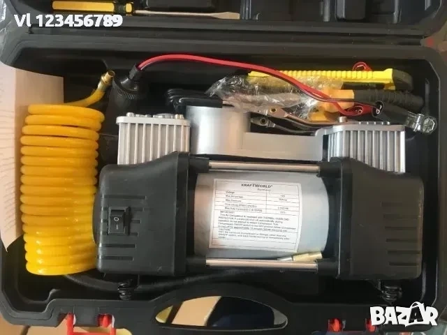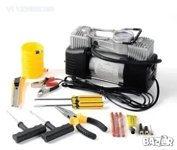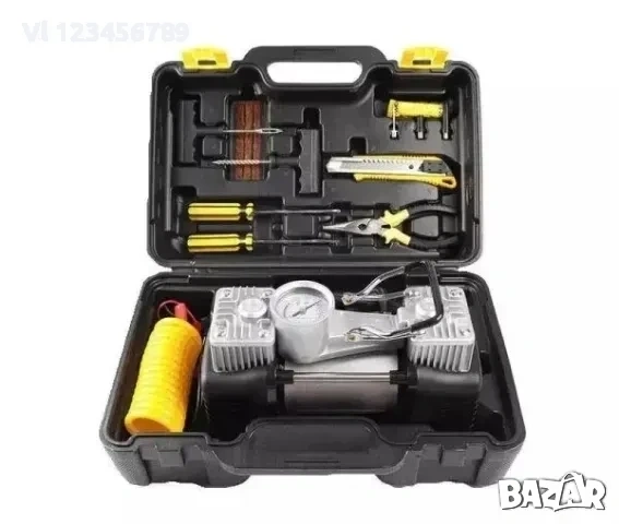 Двуцилиндров компресор с манометър и спираловиден маркуч, осигуряващ много бързо помпане на гуми на автомобили и по-тежкотоварни МПС-та, различни надуваеми продукти като лодки, дюшеци, басейни, топки и др.