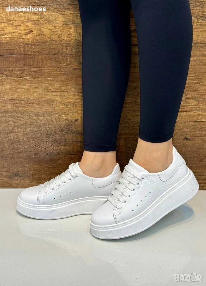 Дамски сникърси от естествена кожа в бяло. Дебела подметка с анатомична извивка, стелка от естествена кожа. Олекотени, изчистени и винаги актуални. Номерация 36-40. Модела е умален с един номер!