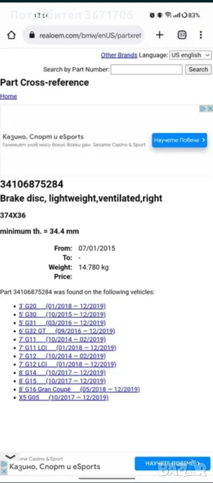 Нови предни оригинални бмв спирачни дискове с парт номера -34106875284-и -34116875283 (ляв десен)-. Предните дискове са с диаметър 374х36мм. Има прикачена снимка на кои модели стават 800€ за комплект предни Нови задни дискове с парт номера-34206896673- и -34206896674 - 370х24мм. 400€ за комплект задни