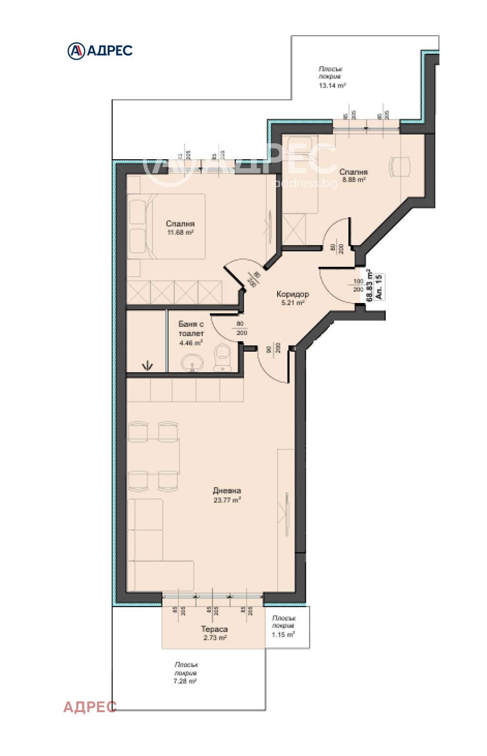 Жилището разполага с площ от 74 кв.м. разпределена в коридор, дневен тракт с кухненски бокс, две спални, балкон, баня и тоалетна.