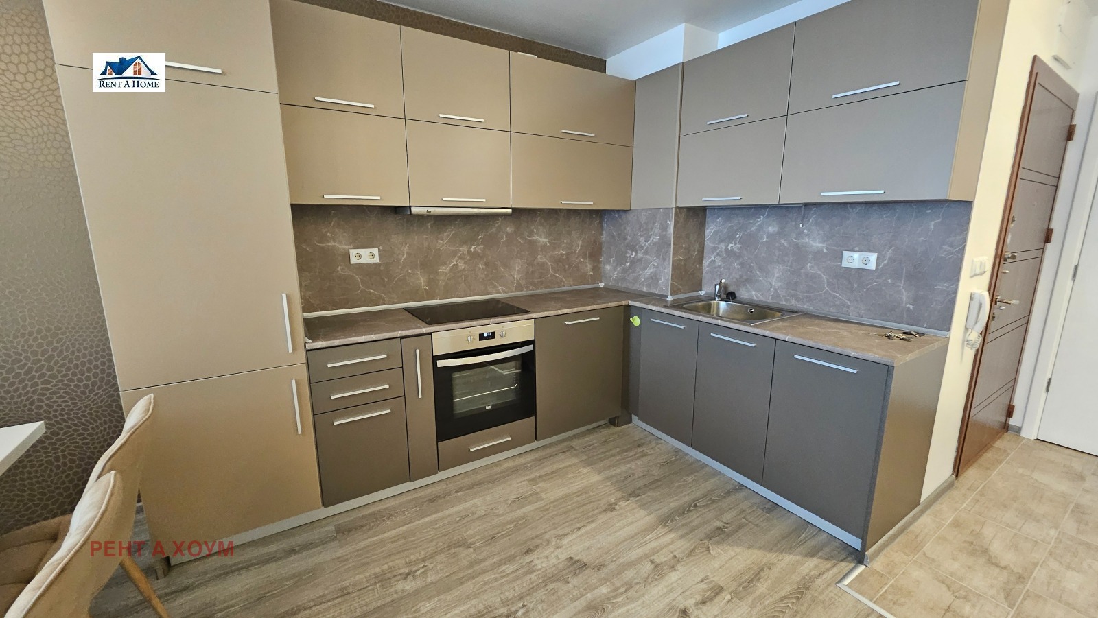 апартамента: хол с кухненски бокс и трапезария, две спални, баня с тоалетна, сервизно помещение и тераса. Отоплението е на газ, има и климатик. Към жилището се отдава и гараж на цена от 150 евро. За повече информация и огледи ни потърсете на посочените телефони. Оферата е за ч.л.