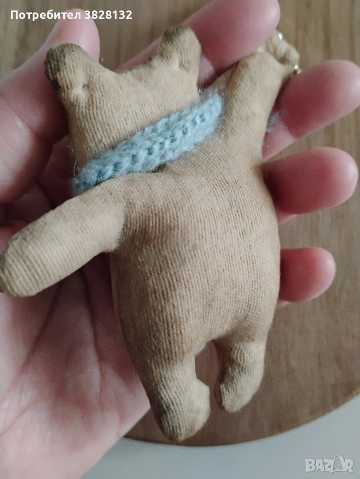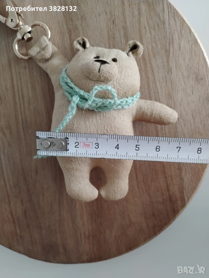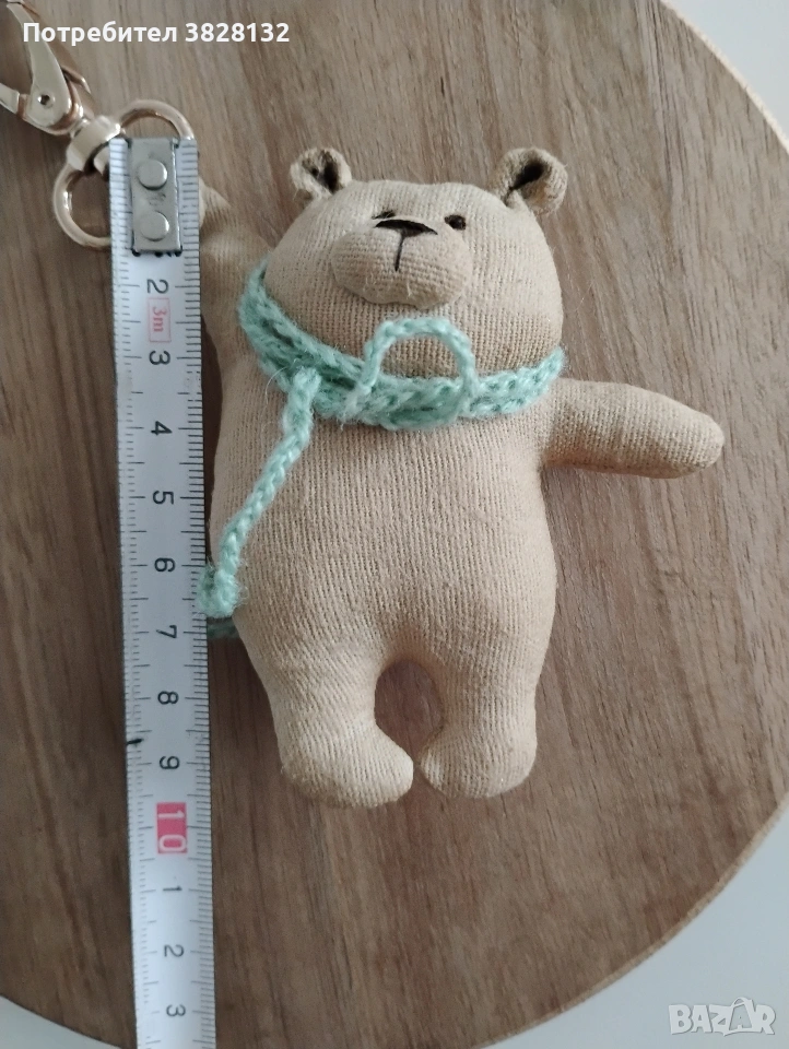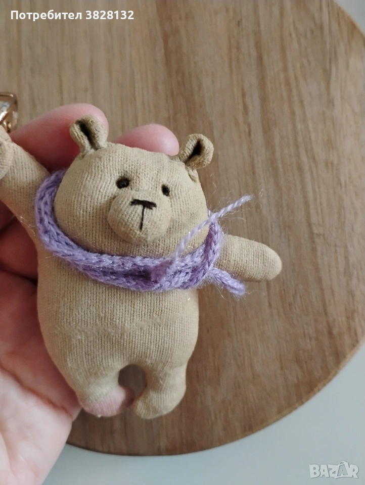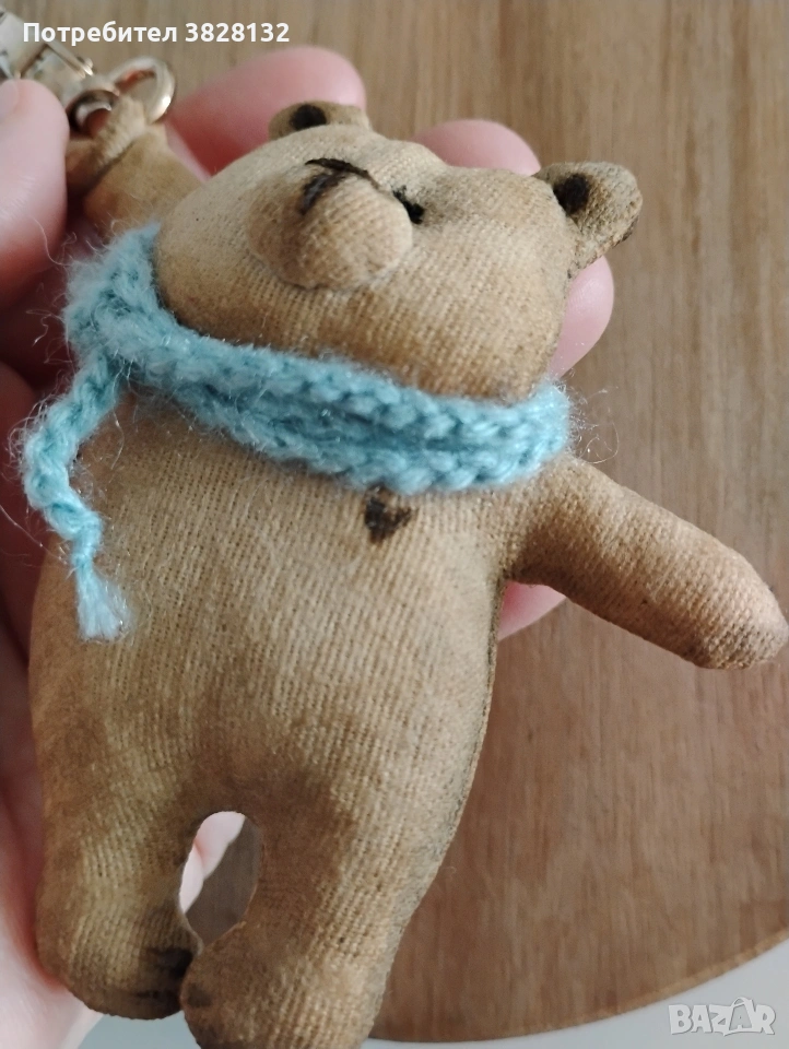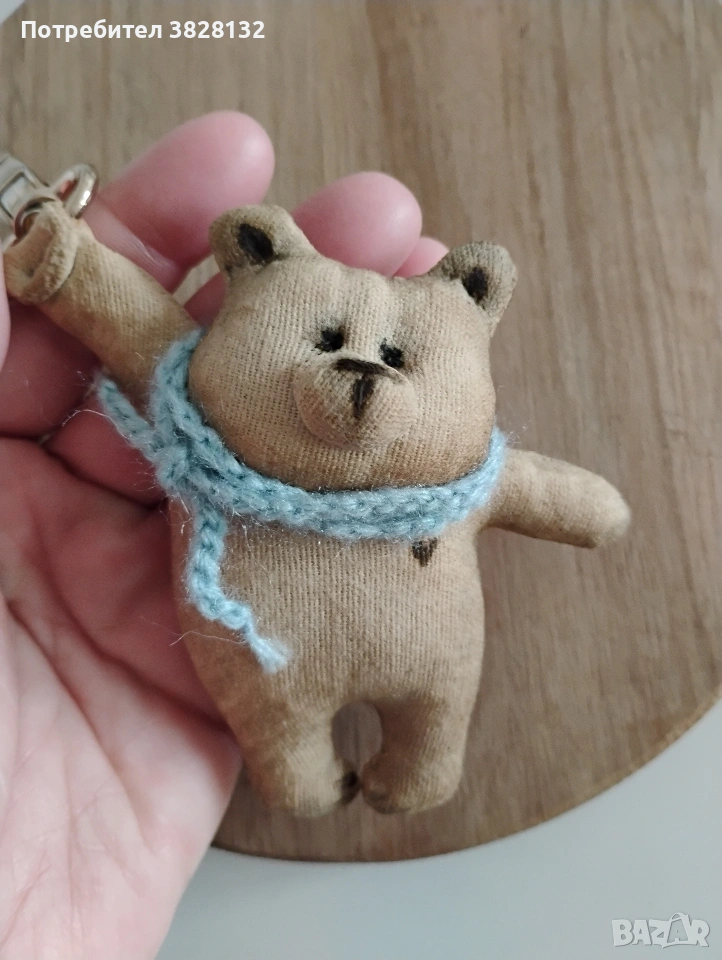 Мече с плетен шал- Уникален аксесоар/ ключодържател, ръчно го изработих по мой авторски дизайн. Цената е за един брой. Подходящ за всекидневна употреба и добавяне на индивидуалност към чантата или ключовете Ви. Може да стане Ваш другар при пътешествия и снимки. Изработен от памучен плат, пълнеж - вата, използвана специална техника за обработка на плата, за да не се бои от прах и влага, лека тонировка. Не е детска играчка.