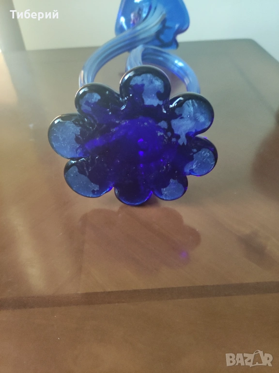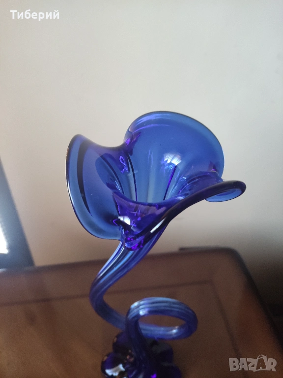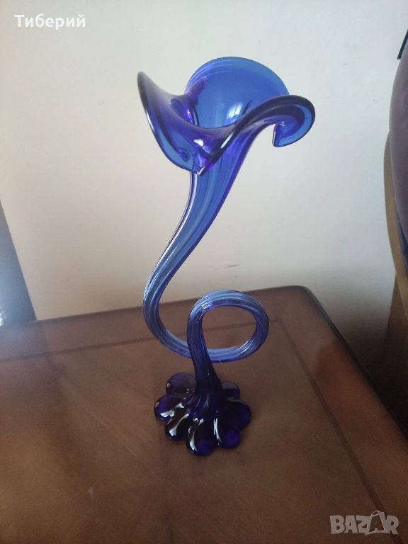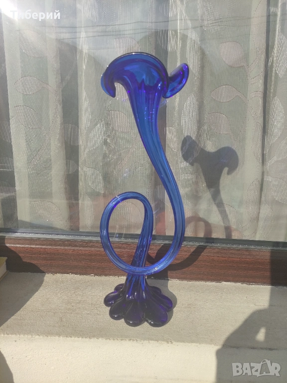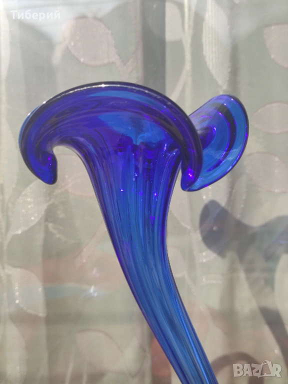 Винтидж ваза от ръчно издухано кобалтово стъкло изработена на остров Мурано - Италия. Висококачествено арт стъкло с уникална форма и нежна извифка в центъра напомняща разцъфнало цвете в стил/ Mind-century modern/. Вазата е изработена 50-те години на миналият век в отлично състояние, без чипиве или надраскване.