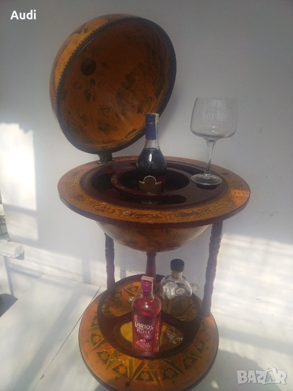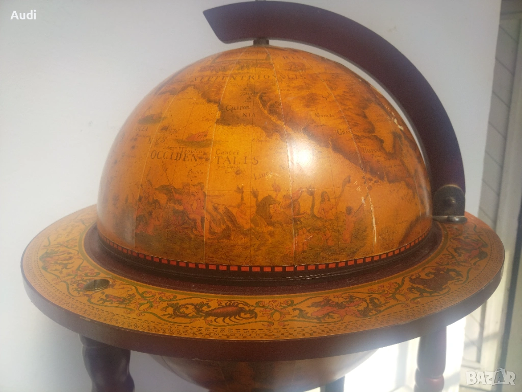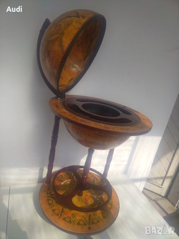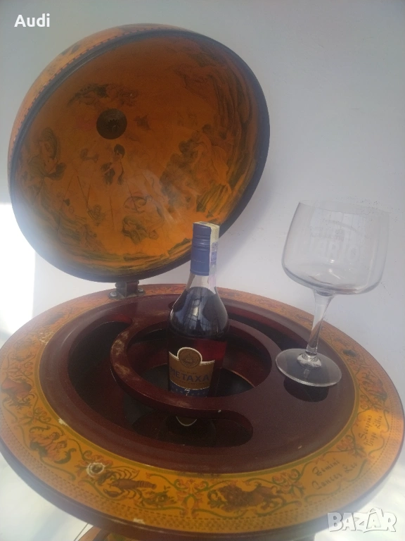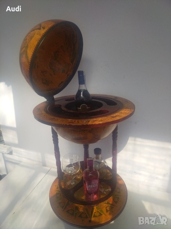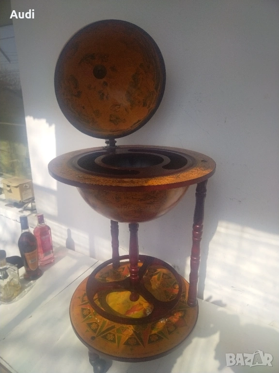 глобус-бар с карта на света. Изработен от дърво с ярки цветове и детайли. Глобус бар с място за бутилки в долната си част и място за бутилки и чаши от горната. Изрисуван със старинна карта на света от външната страна и небесното царство от вътрешната. Идеално допълнение за дома или офиса. Внос от Германия!