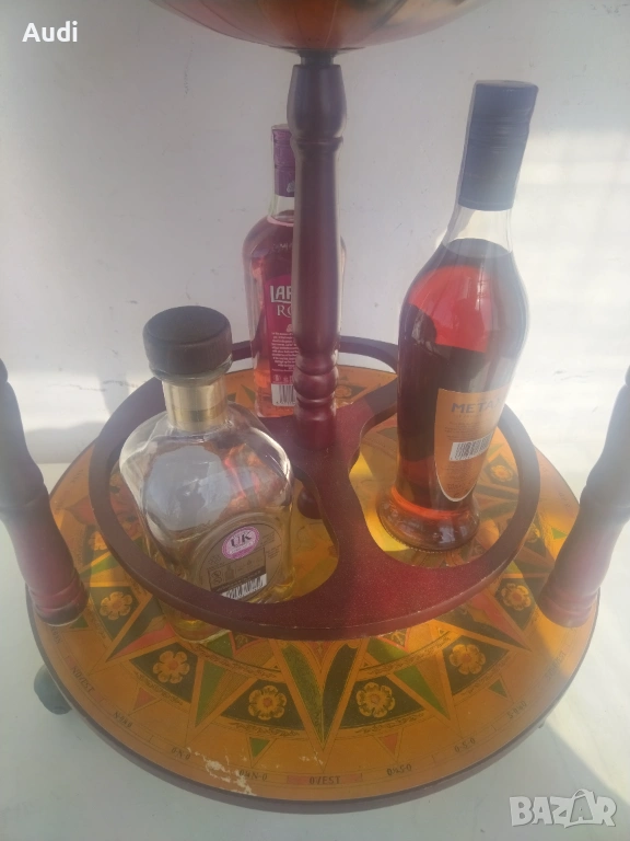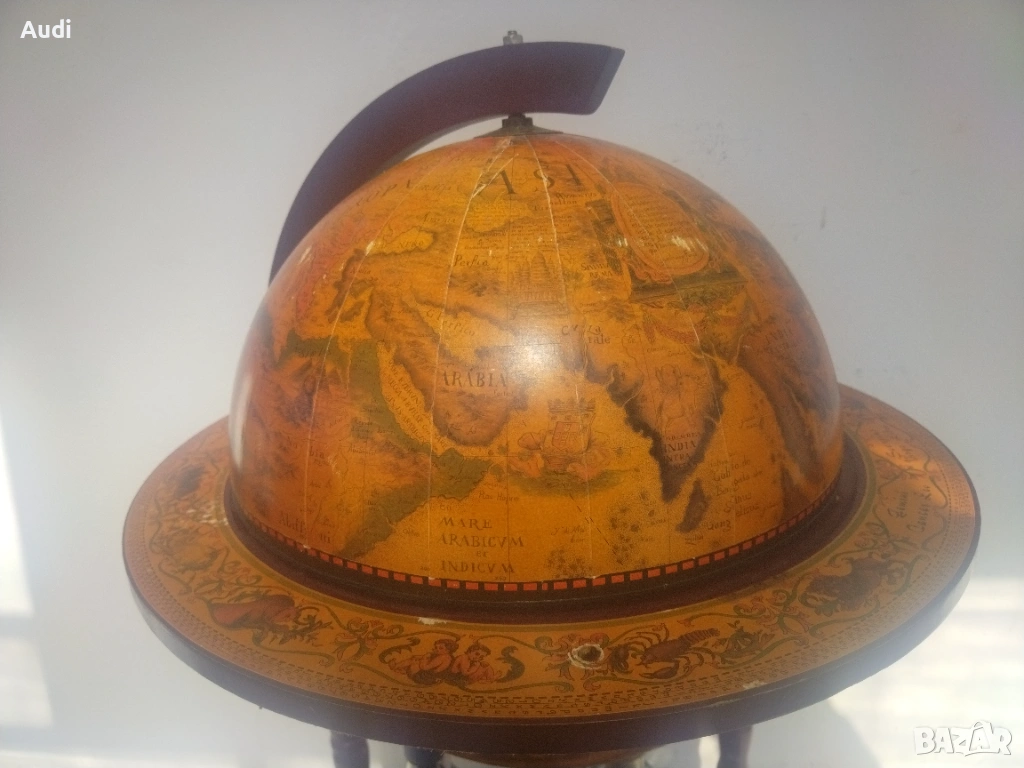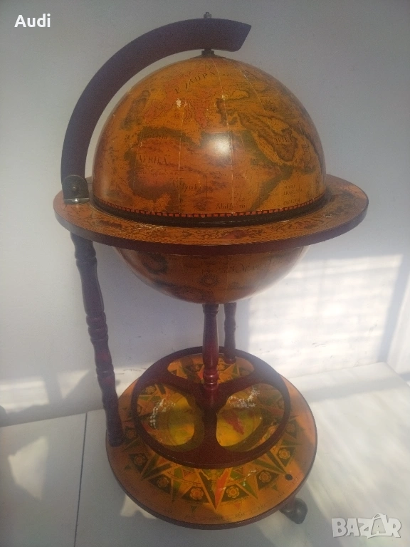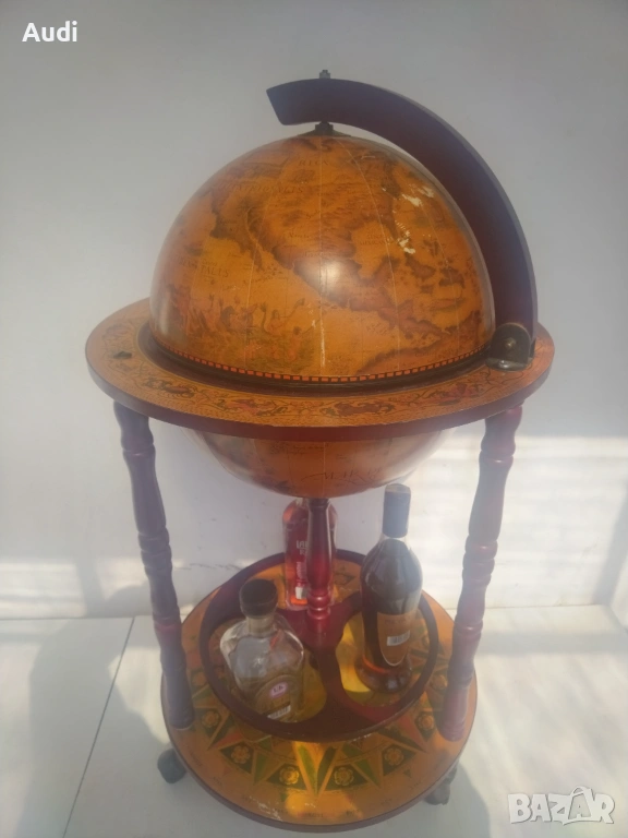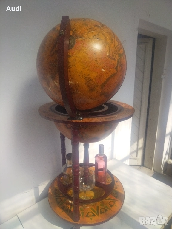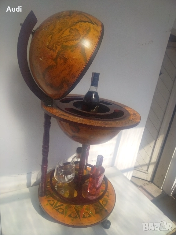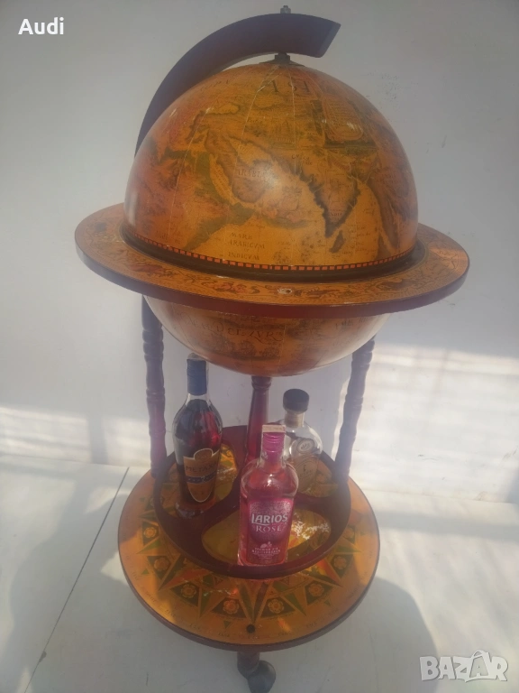 глобус-бар с карта на света. Изработен от дърво с ярки цветове и детайли. Глобус бар с място за бутилки в долната си част и място за бутилки и чаши от горната. Изрисуван със старинна карта на света от външната страна и небесното царство от вътрешната. Идеално допълнение за дома или офиса. Внос от Германия!