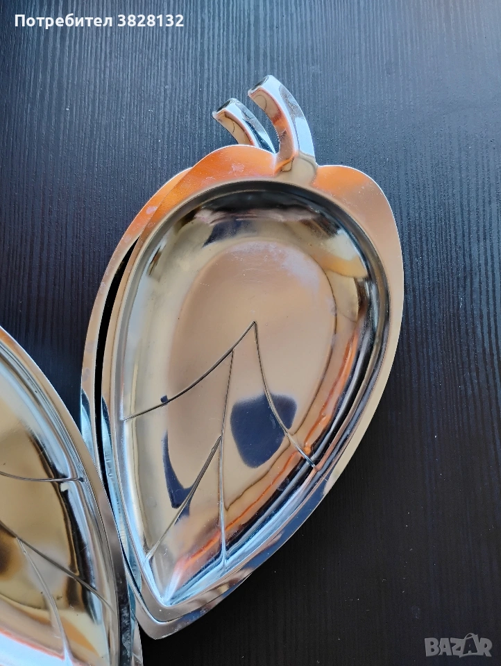 чиния за сервиране във формата на листо, сребрист метал, цената е за 1 брой. налични 4 броя.
