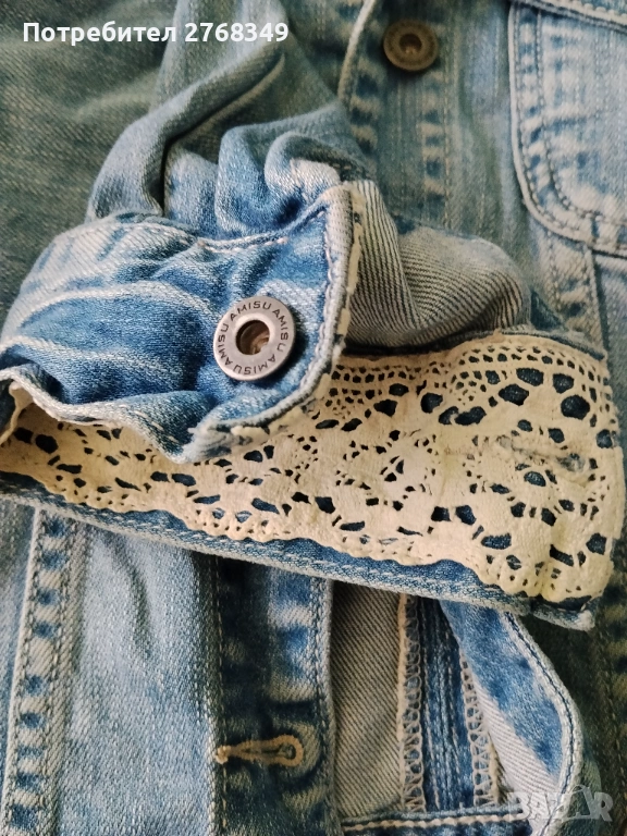 Дамско дънково яке в син цвят от марката Amisu . Ефектни ръкави с дантела. Размер 38-S