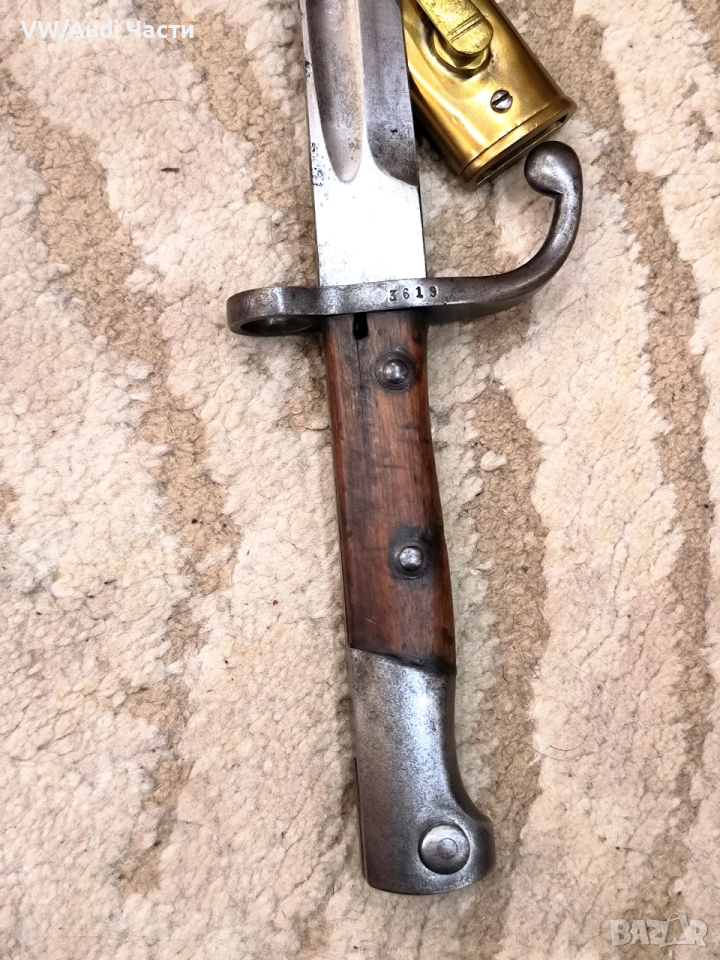 Немски щик за бразилска пушка Маузер М1908. Отлично състояние незаточван, налични маркировки, работещ бутон. Здрава кожена кания и накрайници. Производител Alex Coppel Solingen.Цена без коментар! Изпращам по Еконт с опция преглед и 10% отстъпка от куриерската услуга.
