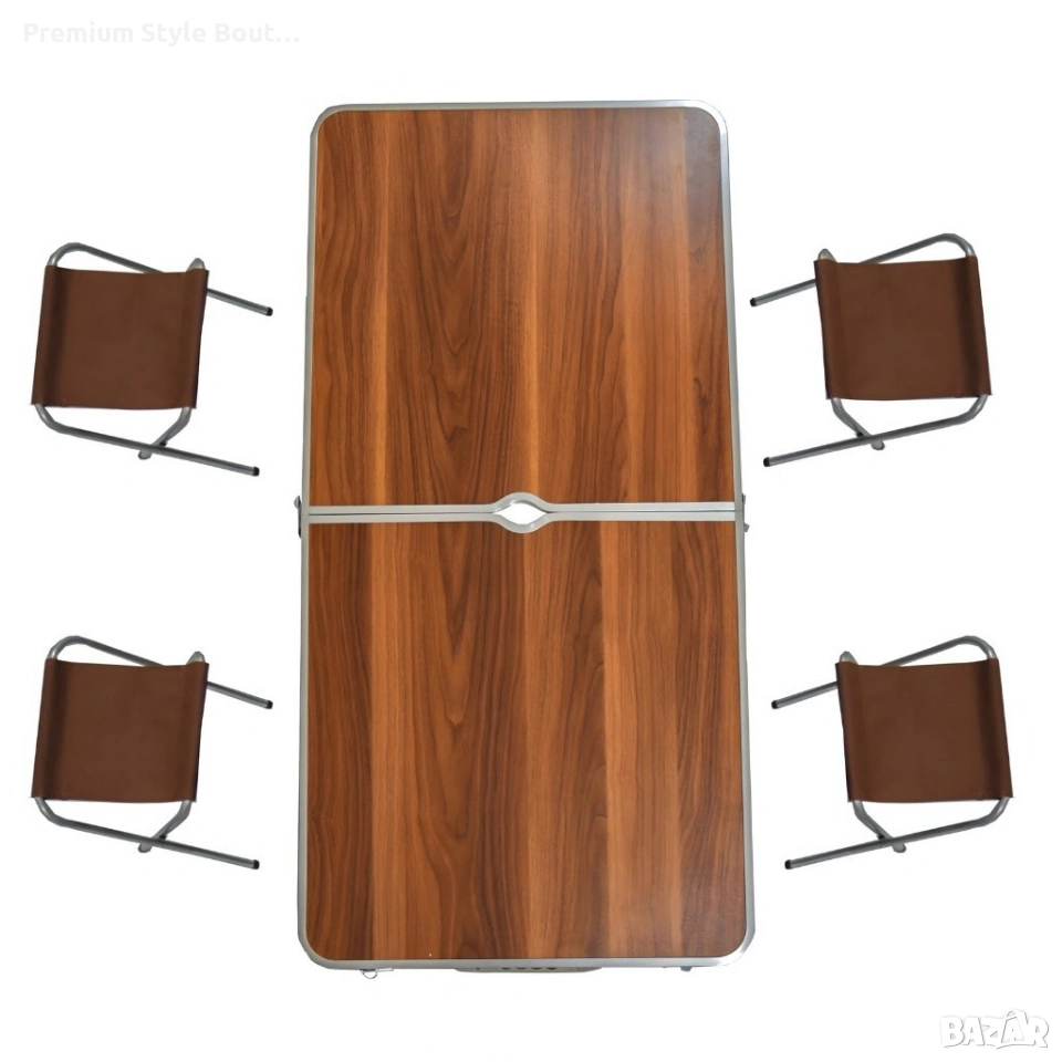 Размери на масата: 120 × 60 × 70 см (максимална височина) Регулируеми височини на плота: 50 / 55 / 70 см Размери на стола: 34 × 34 × 32 см Размери в сгънато състояние: 70 × 60 × 6,5 см Плот: MDF 5 мм с водоустойчиво покритие Конструкция на масата: алуминий (0,7 мм) Конструкция на стола: стомана Материал на седалката: 600D Оксфордска материя Максимално натоварване на масата: 30 кг Цвят: кафяв доставка с Еконт с опция преглед до 3 работни дни.