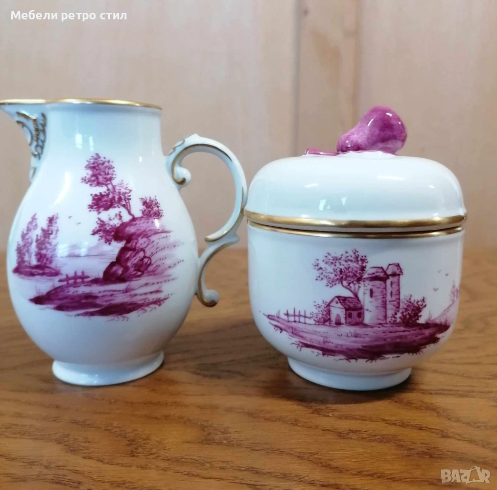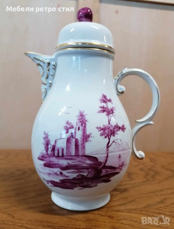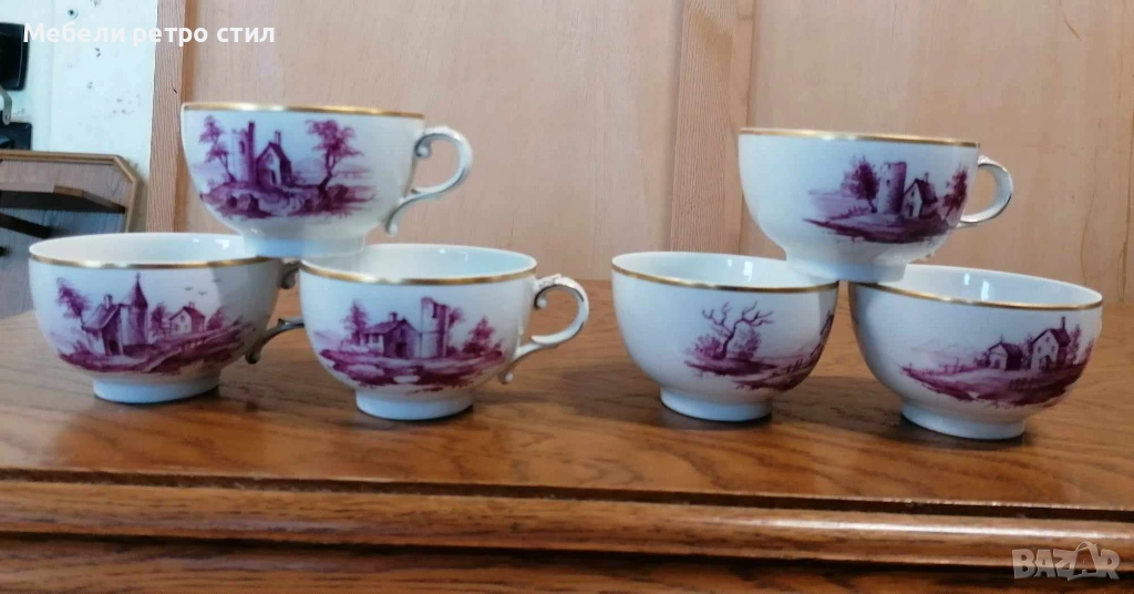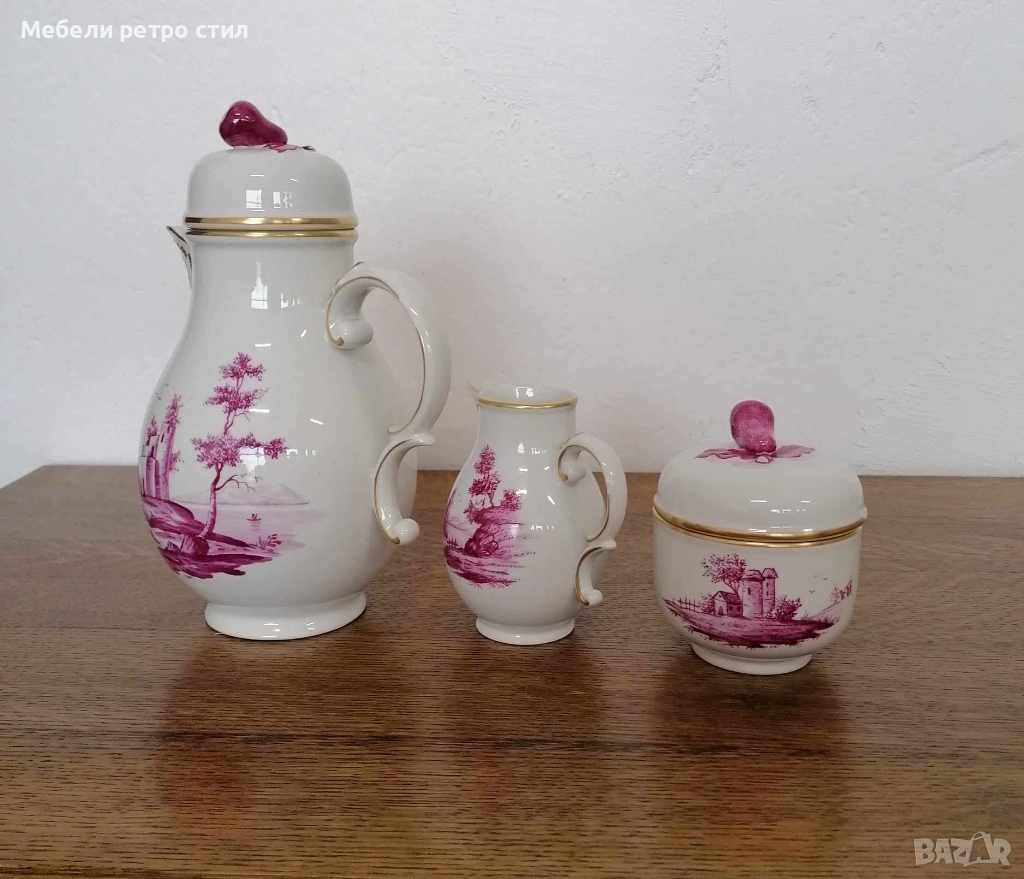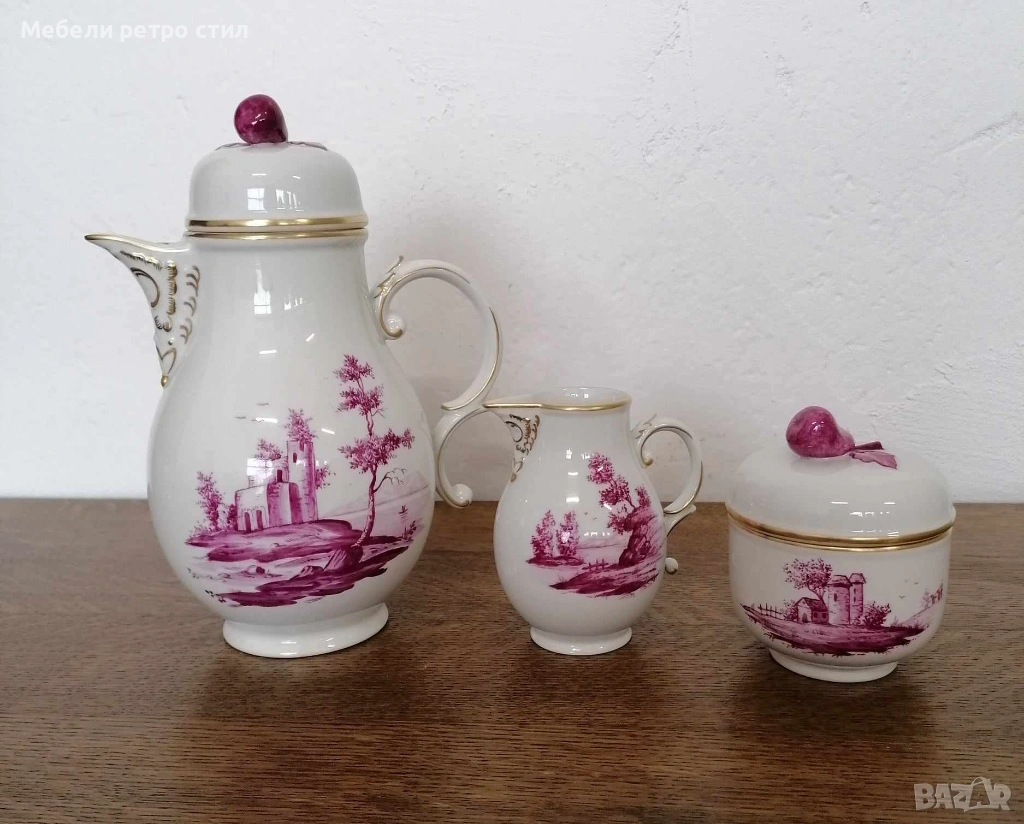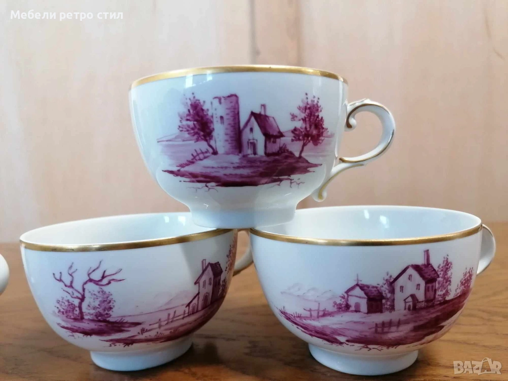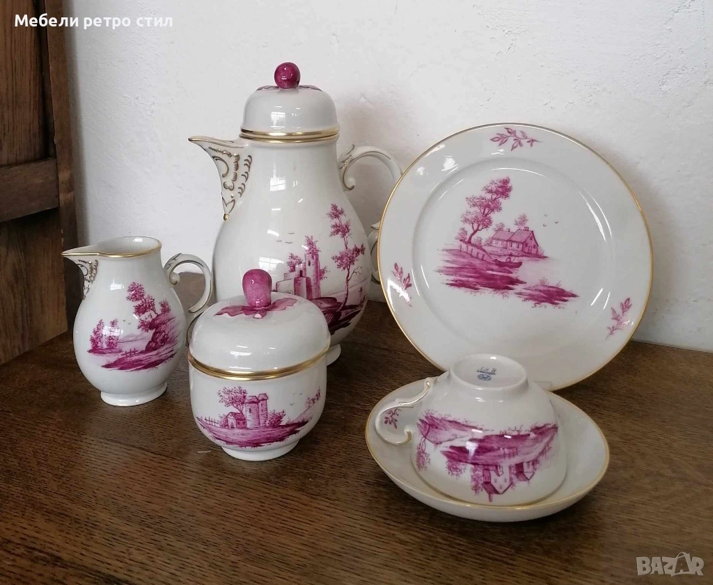 Ръчно рисуван порцеланов сервиз за кафе Purpur Camaieu. Удивителен комплект от последната половина на 20-ти век, 100% ръчно рисуван, всяка част с различен пейзаж. Качеството на комплекта Hochst може да се сравни с това на водещите световни производители на порцелан. Подходящ за колекционери, подарък или стилно сервиране. К-кта включва: 1 бр. висок чайник, 1 бр. захарница, 1 бр. латиера, 6 бр. чашки с вместимост 150 мл, 6 бр. подложни чинийки - 13 см и 6 бр. десертни чинийки - 19 см. Цена за целия сервиз 190 € / 371,61 лв.