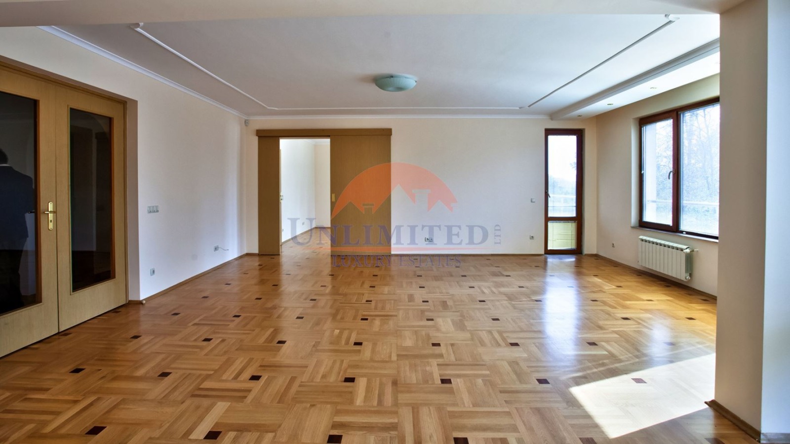 Страхотен апартамент с прекрасна гледка към парк. Състои се от: хол с камина, трапезария, отделна кухня, главна спалня със собствена баня, три спални, две бани. Климатик. Алармена система. Луксозни общи части.