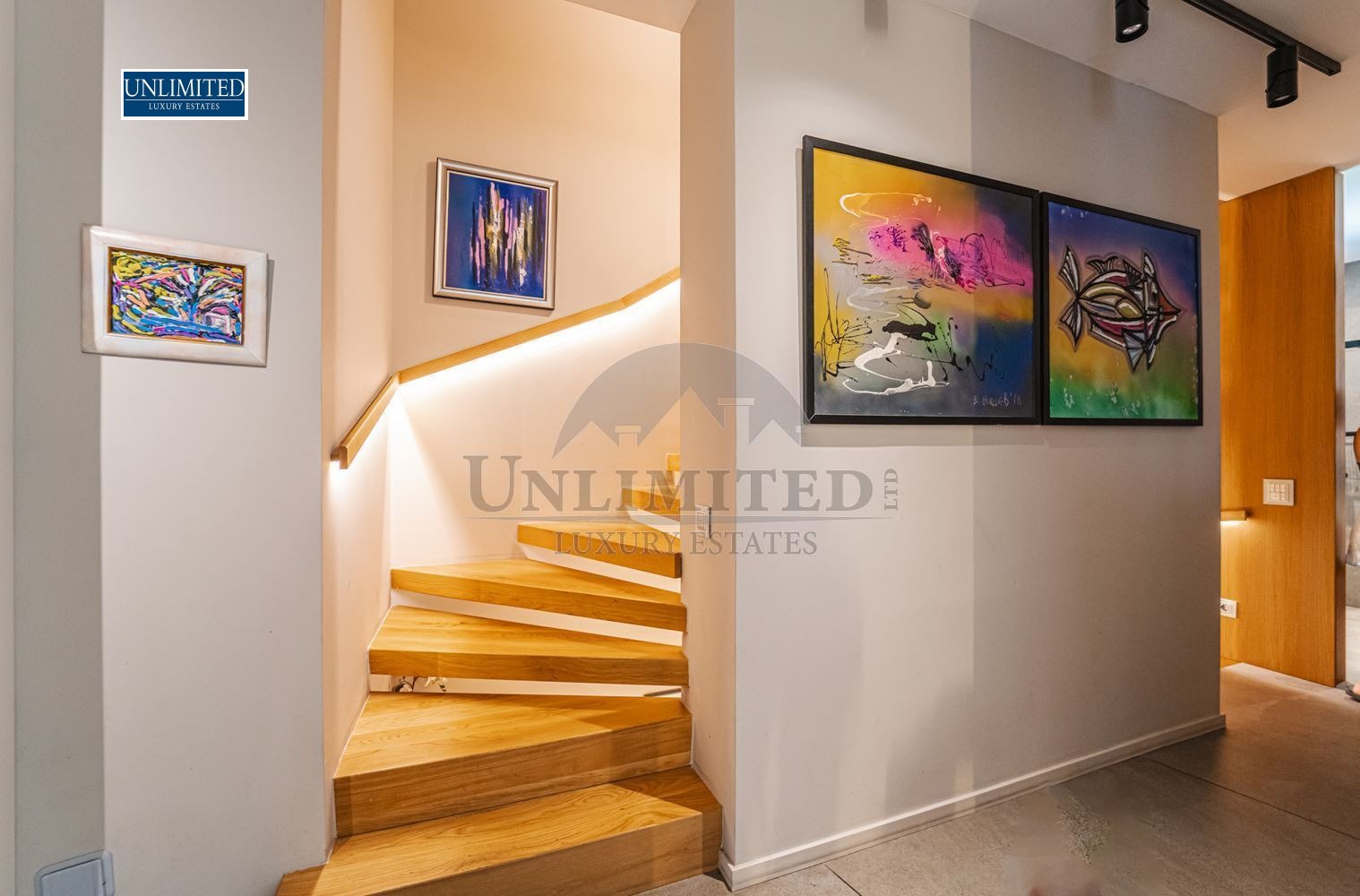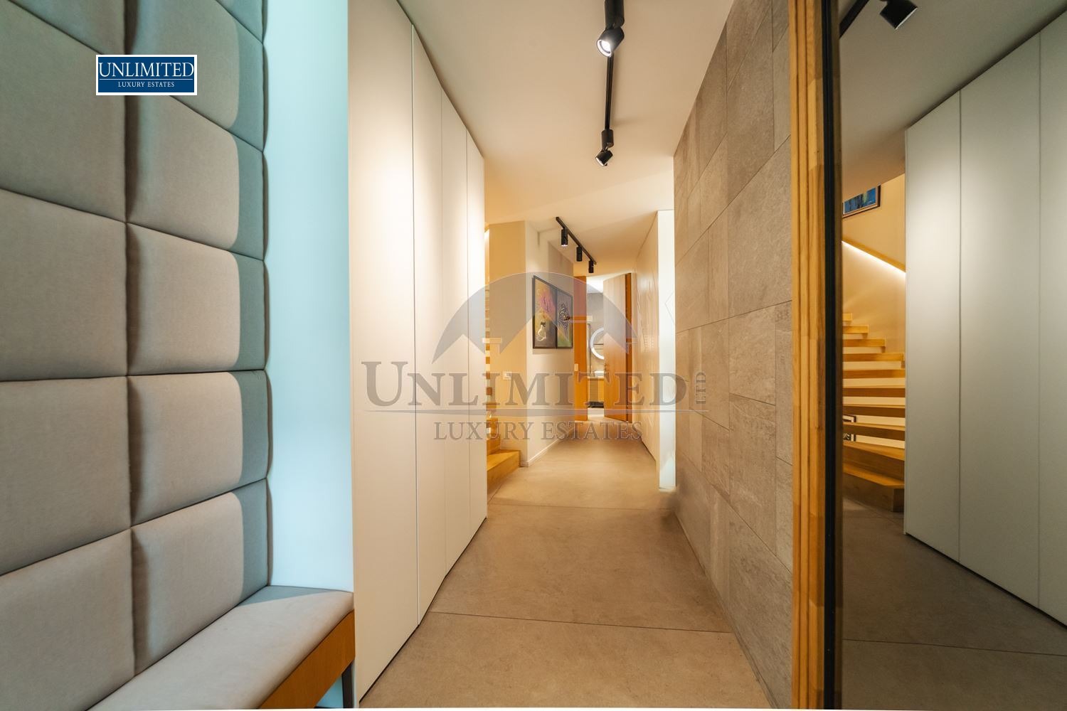 Интериорът е изпълнен с висок клас материали, дизайнерски мебели, модерни осветителни решения и индивидуални арт акценти.