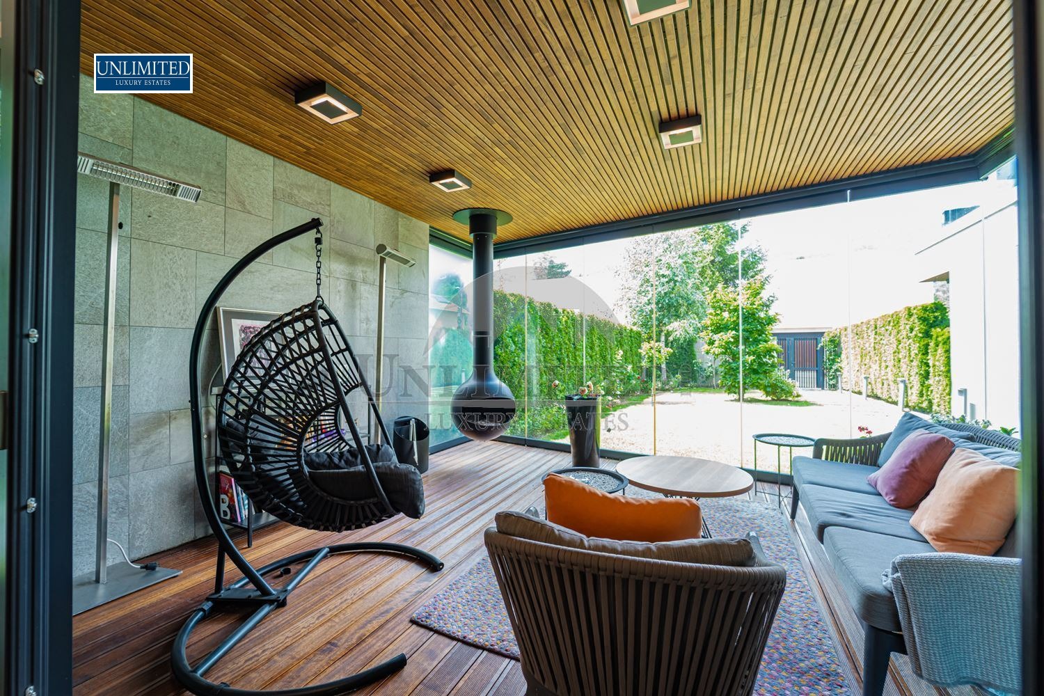 Покрита веранда с дизайнерска камина и място за мека мебел