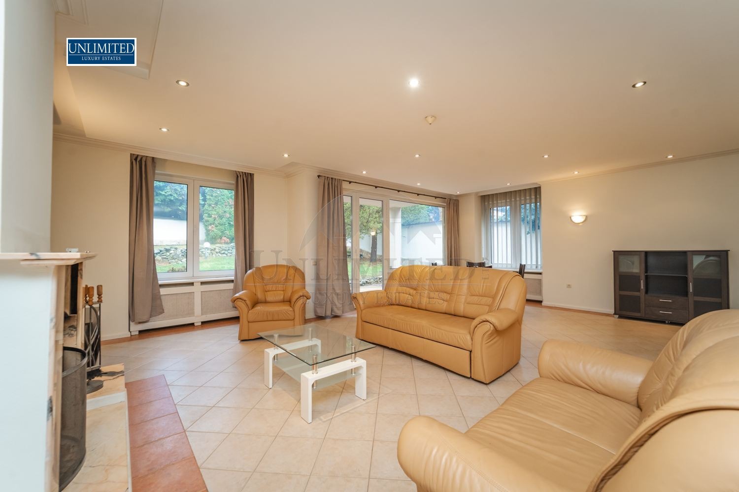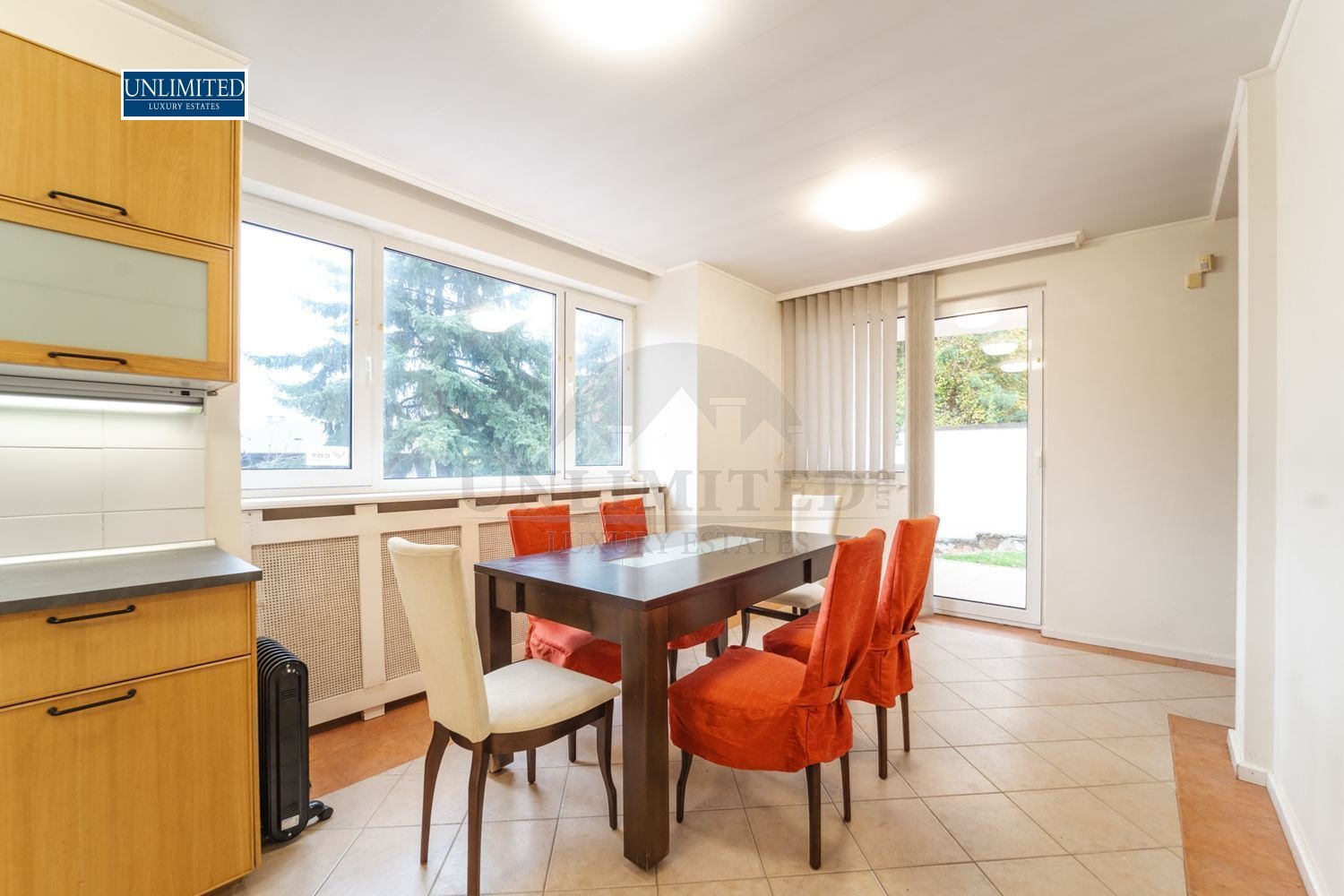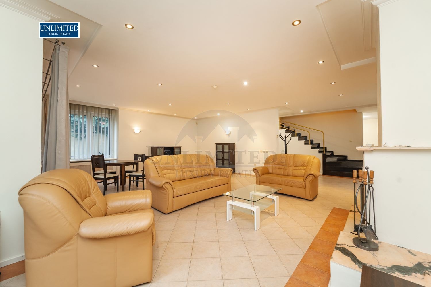 Bright and spacious living room with a fireplace, dining area, and fully equipped kitchen with direct access to the garden. The open layout creates a welcoming atmosphere, ideal for family living and entertaining guests.
