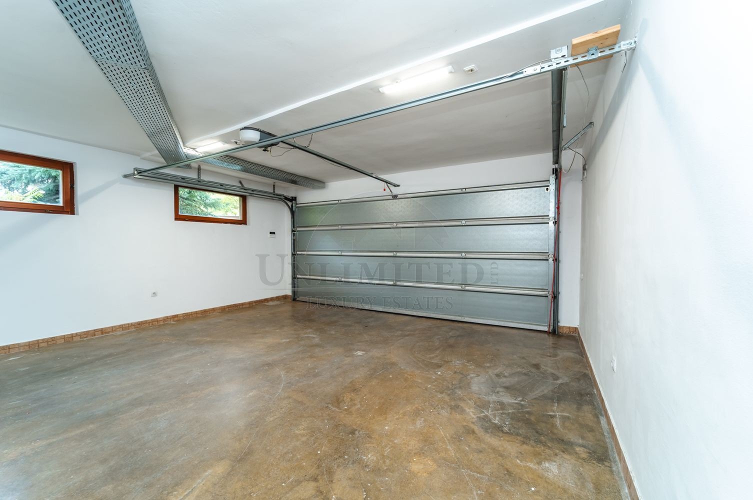 Първи етаж: просторен хол с камина, кухня с трапезария и излаз към градината, тоалетна за гости, двоен гараж с топла връзка;