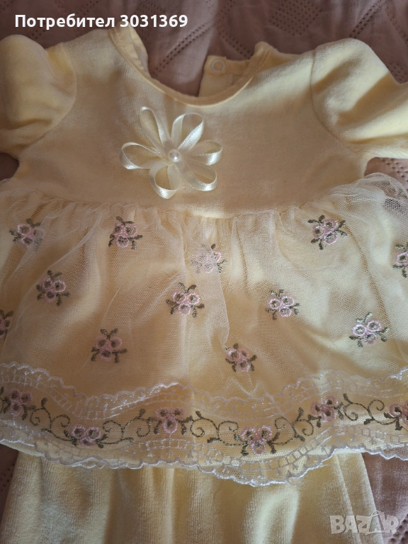Продавам комплект за изписване за бебе момиче. Включва рокличка, ританки, бяло изчистено боди и шапка.