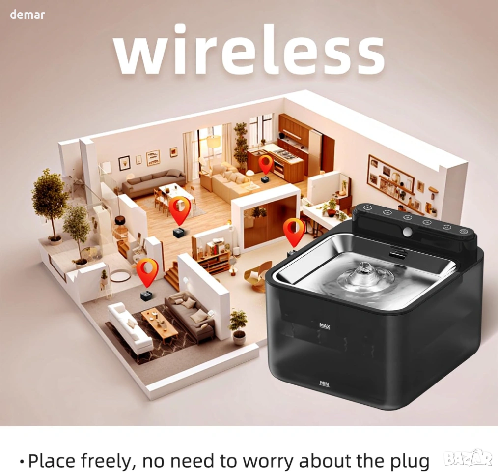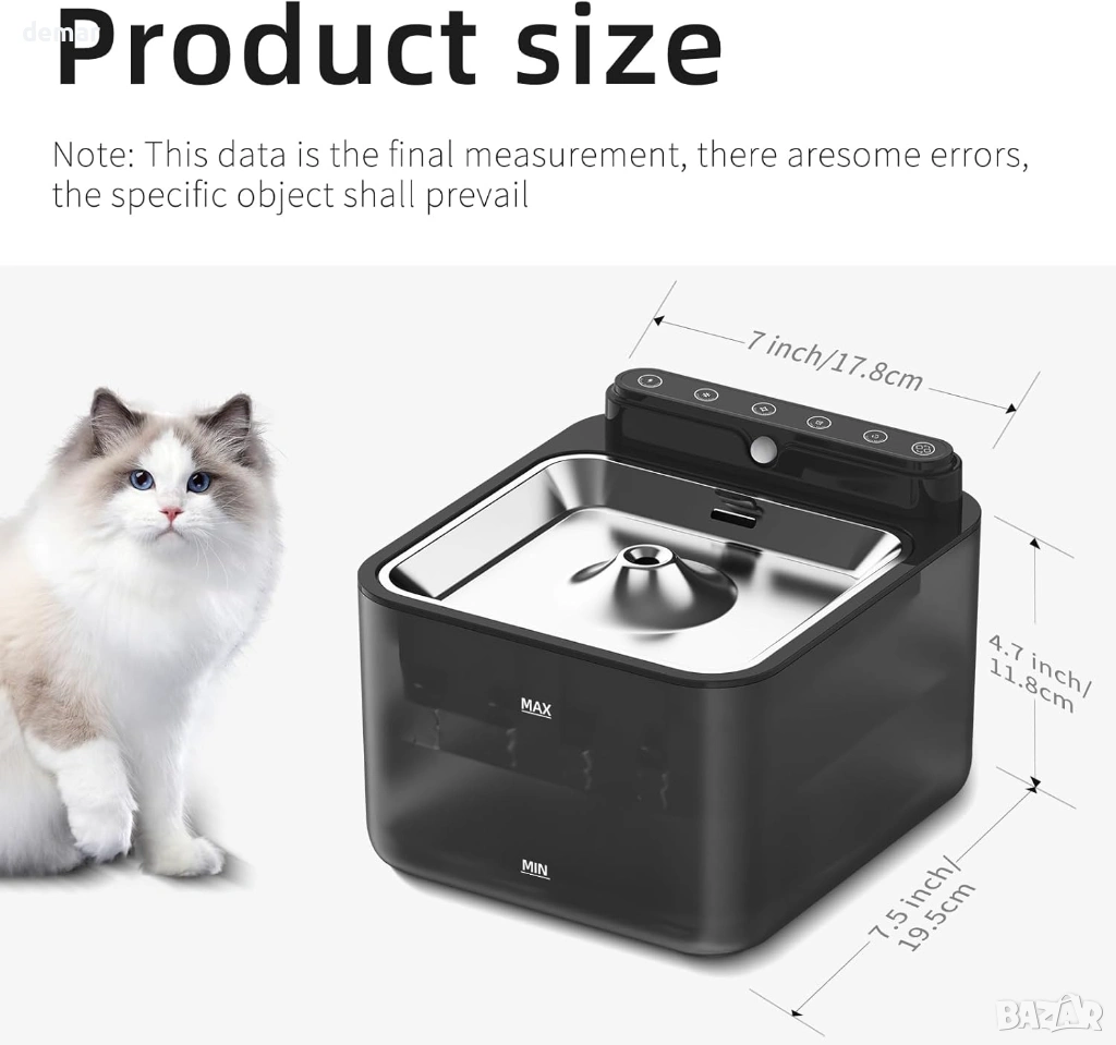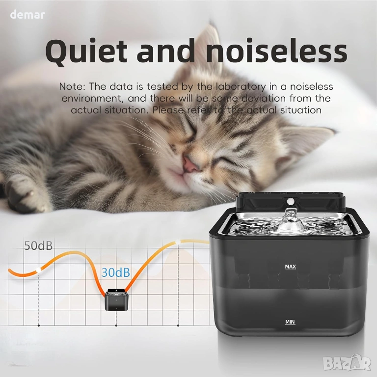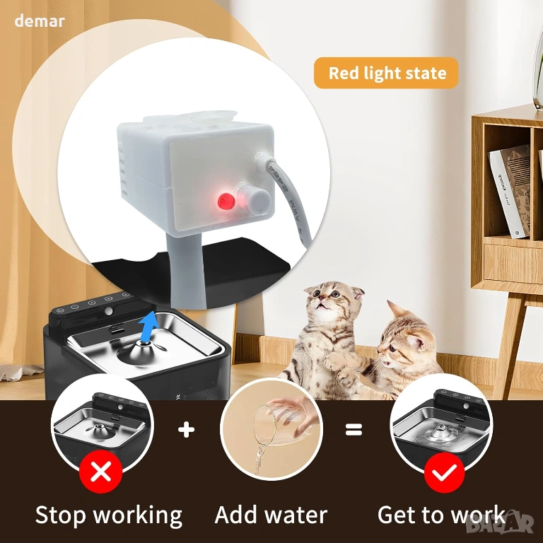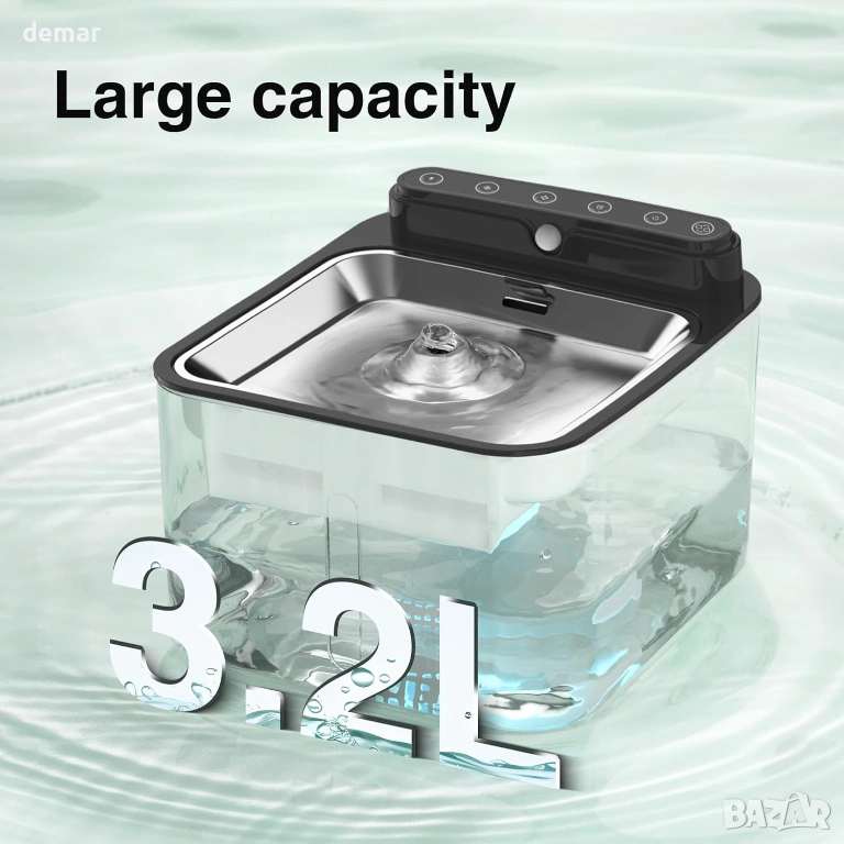 фонтан за вода за котки с три режима на работа, включително активиране от сензор за движение, времеви режим на струя на всеки 15 минути и непрекъсната струя, подходяща за различни навици за пиене. Разполага с голям воден капацитет от 325 мл и вградена акумулаторна батерия, която позволява напълно безжично поставяне навсякъде в дома. Тихата работа от 30 dB осигурява минимално смущение, а горната част от неръждаема стомана предлага хигиенична и издръжлива повърхност за пиене. Полупрозрачен резервоар улеснява наблюдението на нивата на водата с един поглед. Многостепенната филтрираща система помага за премахване на косми, прах и миризми, за да се поддържа по-чиста и прясна вода, а конструкцията без BPA подпомага безопасната ежедневна хидратация на котките.