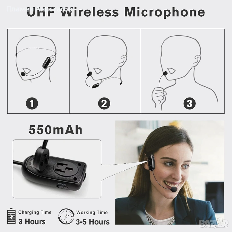 Моделът се предлага с UHF безжичен микрофон, който осигурява стабилна връзка и свобода на движение. Микрофонът може да се използва като headset микрофон или като ръчен микрофон, което го прави удобен за различни ситуации – преподаване, презентации, водене на събития или спортни тренировки.