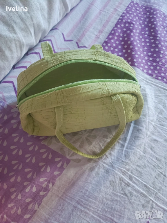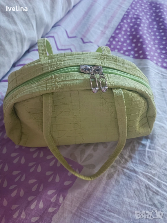Малка зелена чантичка с два ципа и две дръжки подходяща за гримове.