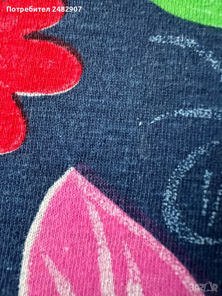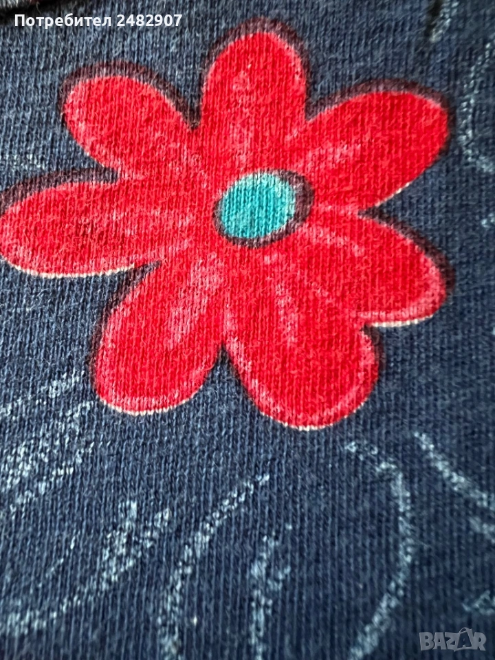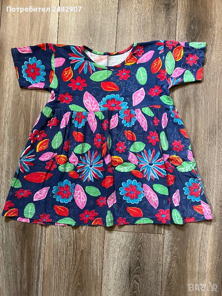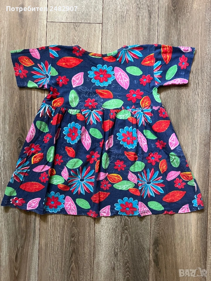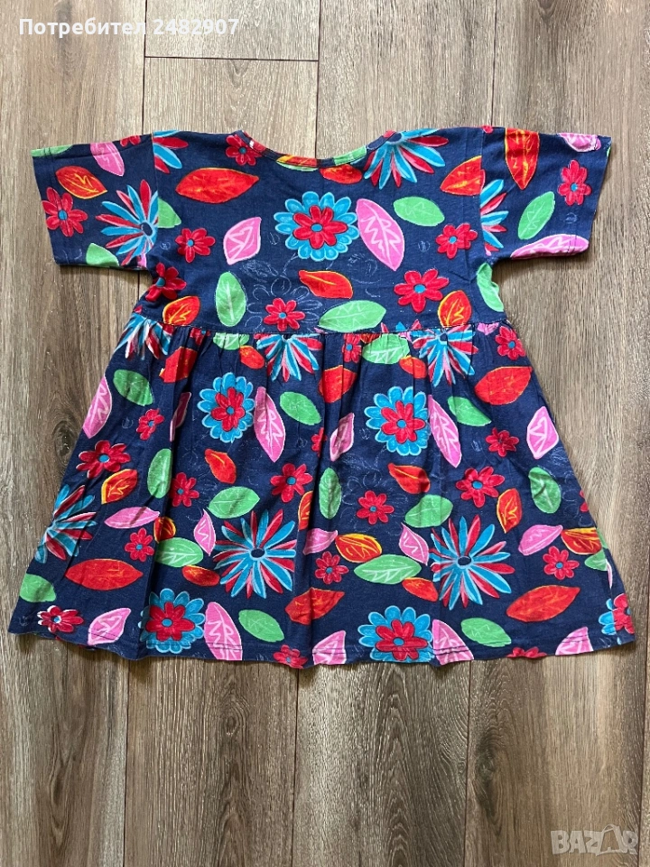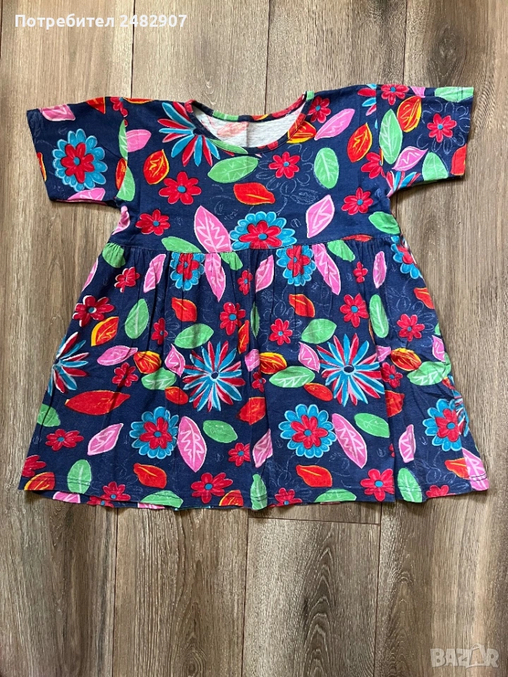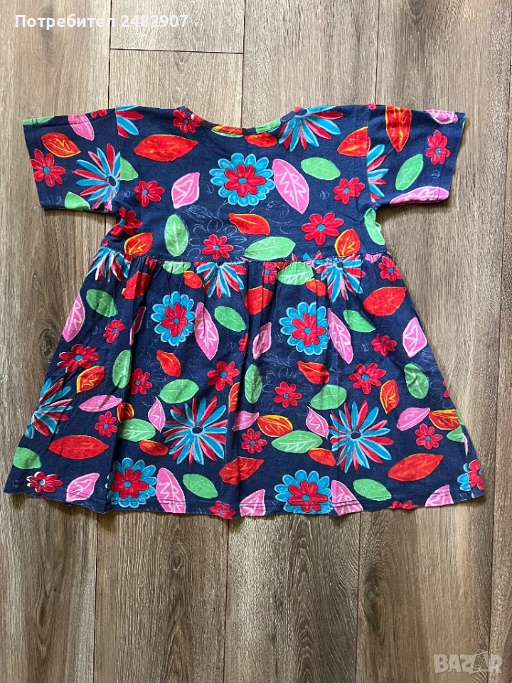 Детска рокля за възраст 4-5 години. Съдържа 100 % памук. Ширина в раменете - 36 см, ширина под мишниците - 42 см, ширина в долната част - 79 см, дължина от рамото до долу - 59 см, дължина на ръкава от рамото - 14 см, ширина на ръкава в долната част - 13 см. Много запазена, почти не е използвана.