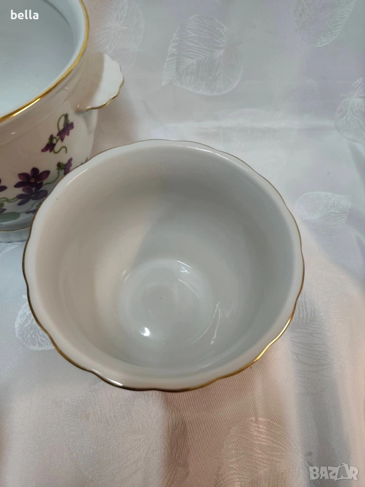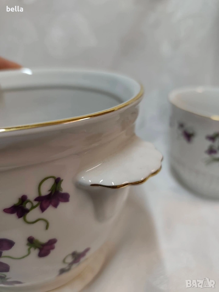​Красив мотив с теменужки в наситено лилаво и деликатен златен кант по ръбовете.