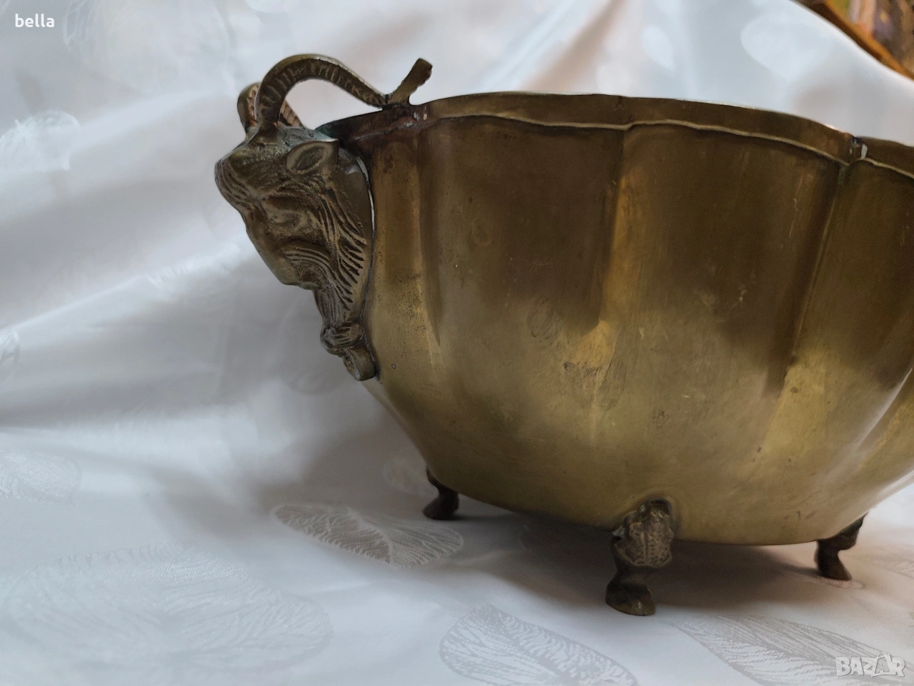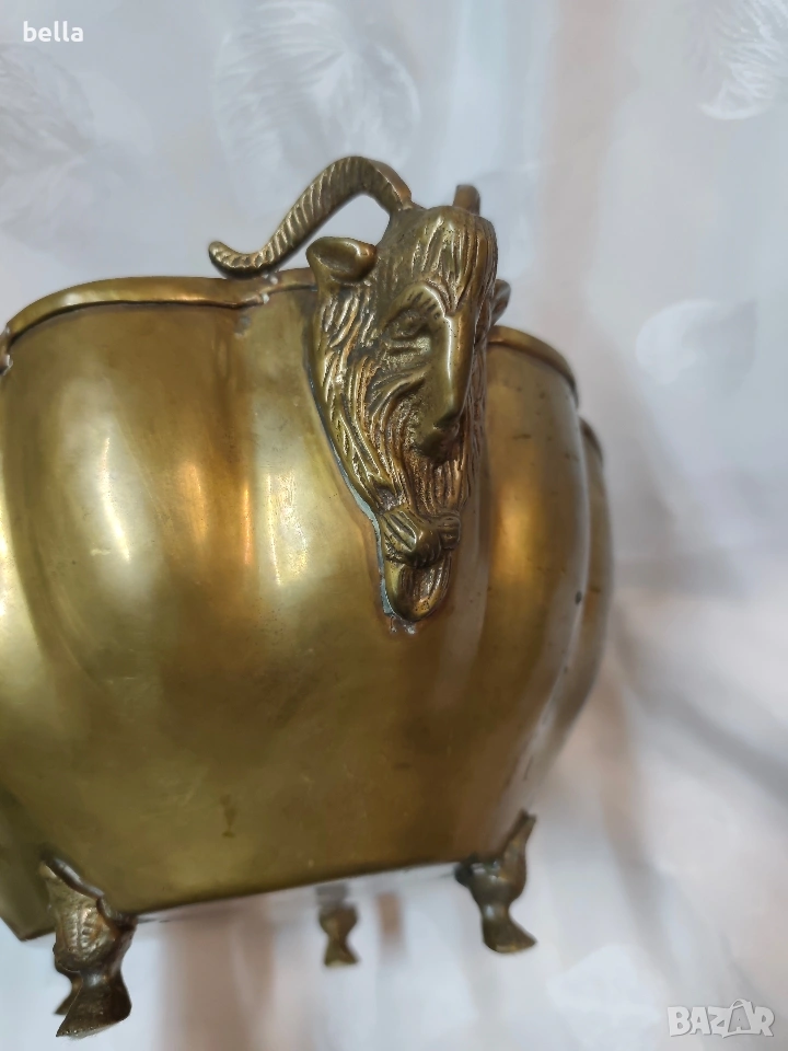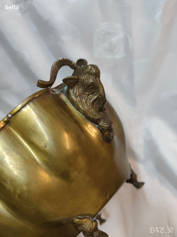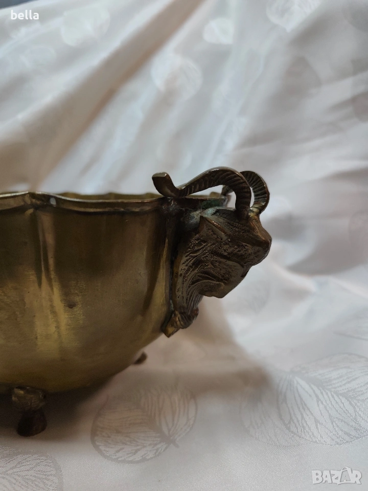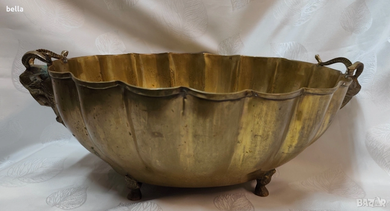 Антикварна бронзова жардиниера „Овни“ – Необарок, XIX век Масивна бронзова антикварна жардиниера, изработена в стил Необарок. Предметът е излят от висококачествен бронз (или месинг) и се отличава с детайлна изработка. Тялото е канелирано (набраздено), а акцентът са двете впечатляващи дръжки, оформени като глави на овни – символ на изобилието и силата.Дължина 42 см и 15 см височина тежи близо 2 кг .Цена 200 евро