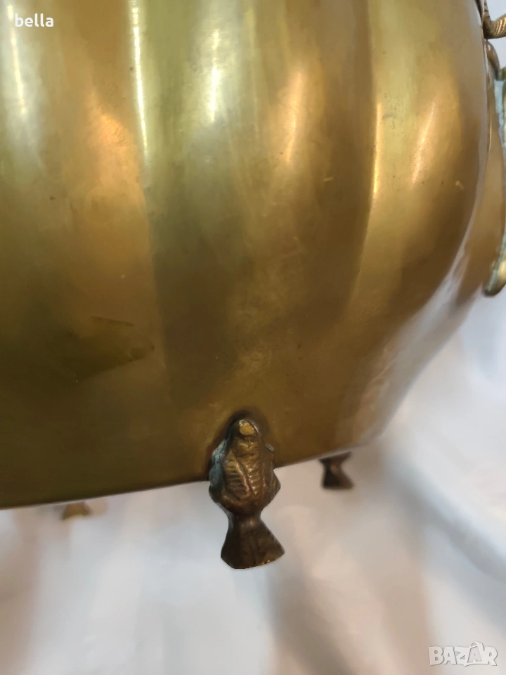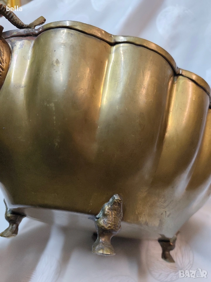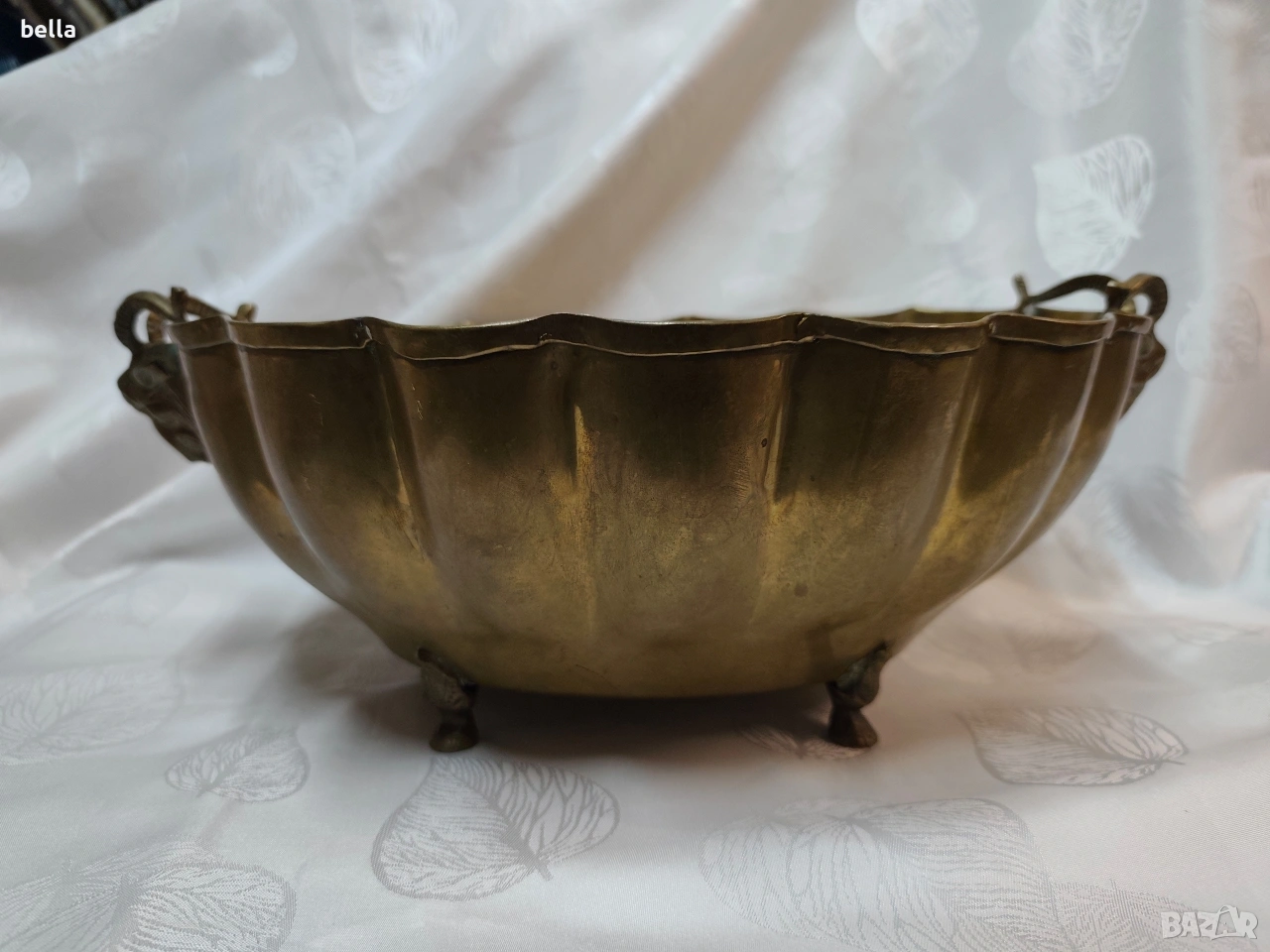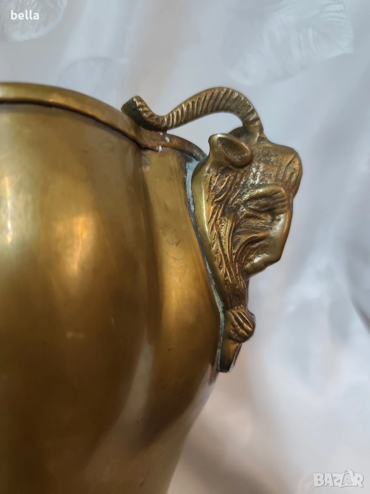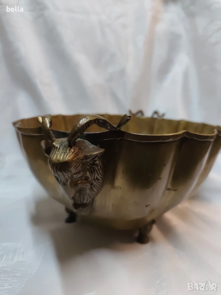 Антикварна бронзова жардиниера „Овни“ – Необарок, XIX век Масивна бронзова антикварна жардиниера, изработена в стил Необарок. Предметът е излят от висококачествен бронз (или месинг) и се отличава с детайлна изработка. Тялото е канелирано (набраздено), а акцентът са двете впечатляващи дръжки, оформени като глави на овни – символ на изобилието и силата.Дължина 42 см и 15 см височина тежи близо 2 кг .Цена 200 евро