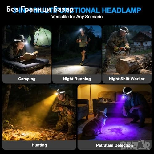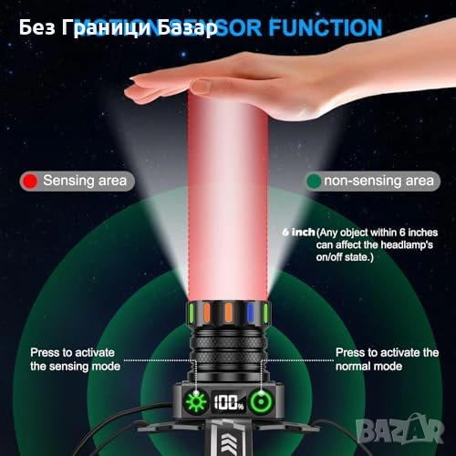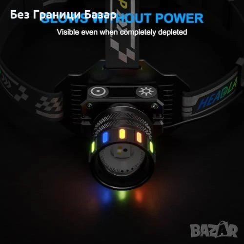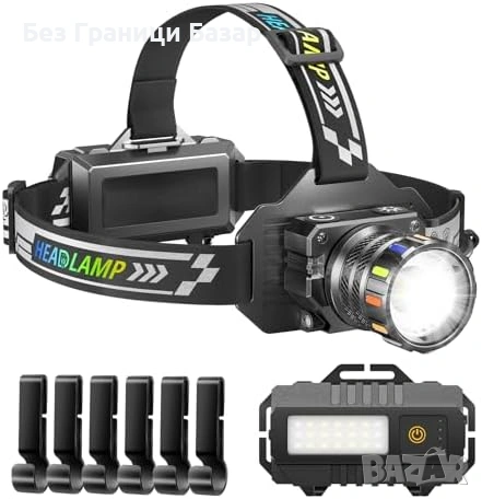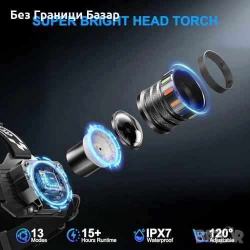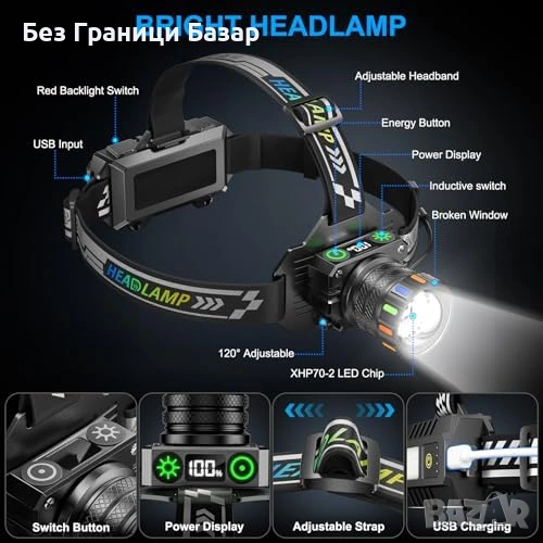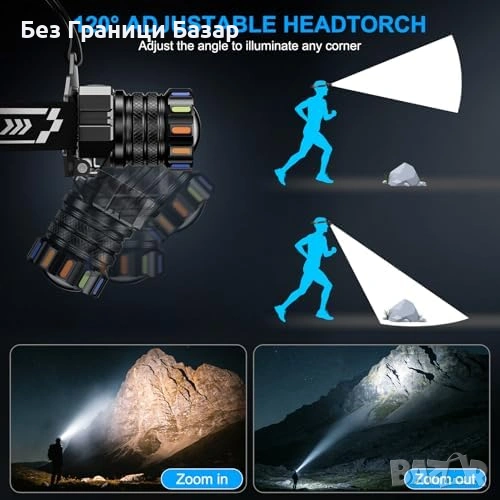 Нов Мощен челник USB-C 13 режима IPX7 сензор 120° регулируем, светлина глава