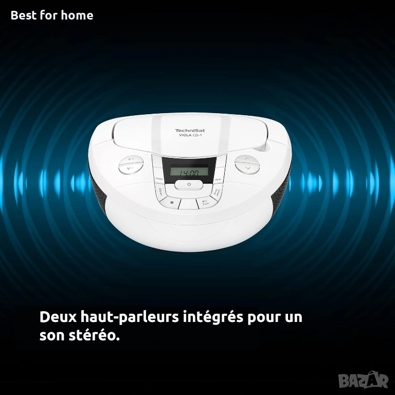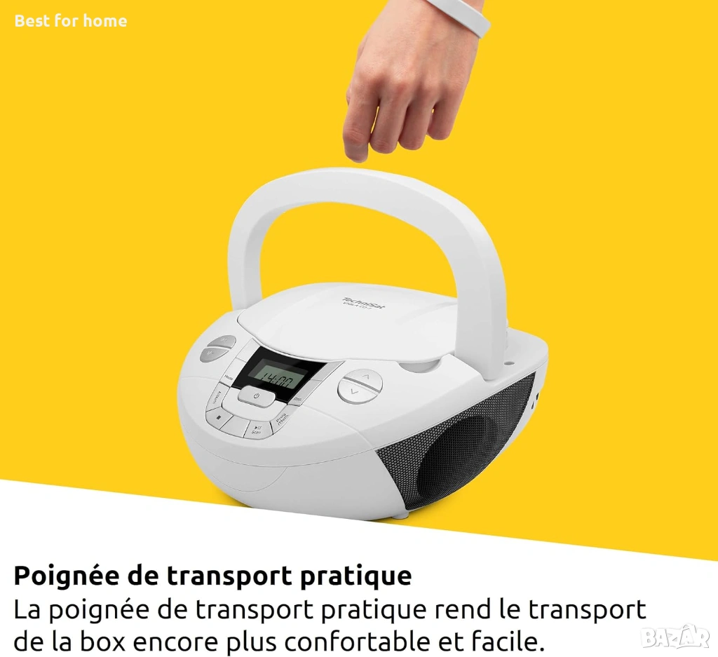 TechniSat Viola CD-1 преносим стерео CD плейър, бумбокс с удобна дръжка (CD радио, FM радио тунер, Bluetooth приемник, 2 x 1 W RMS мощност, захранване от мрежата и батерия) бял.