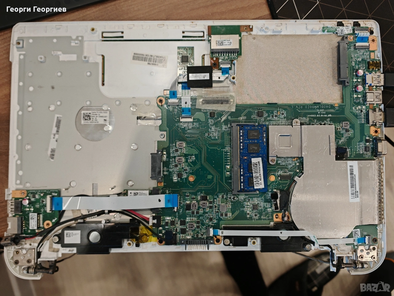 Налични са клавиатура, работещо дъно + процесор, букси, wifi, говорители. Всичко, което се вижда на снимката.