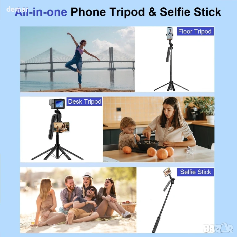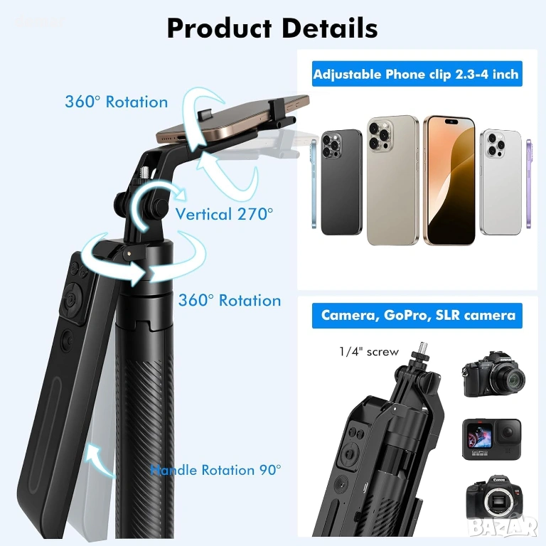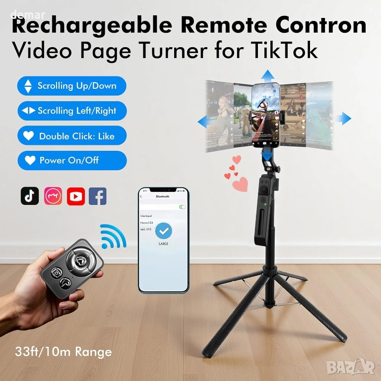 Статив за проследяване за телефон, задвижван от изкуствен интелект, с вградена технология за камера, която автоматично следва лицето ви, без да е необходимо приложение, като ви държи центрирани, докато снимате, стриймвате или видео чатите. Сгъваемият дизайн работи както като разтегателен селфи стик, така и като стабилен подов статив с четири крака и регулируема височина до 198 см, като същевременно остава компактен и лек за пътуване. Въртяща се на 360° хоризонтална и 270° вертикална поставка за телефон поддържа както портретно, така и пейзажно снимане и пасва сигурно на повечето смартфони. Включеното безжично дистанционно управление работи до 10 метра и поддържа бързо сдвояване с iOS и Android устройства, докато управлението с жестове позволява прости ръчни сигнали за стартиране или паузиране на проследяването. Две подвижни запълващи светлини с регулируема яркост и цветови режими подобряват осветлението в среда със слаба светлина. Универсалният 1/4" монтаж позволява съвместимост с камери, уеб камери и други устройства.