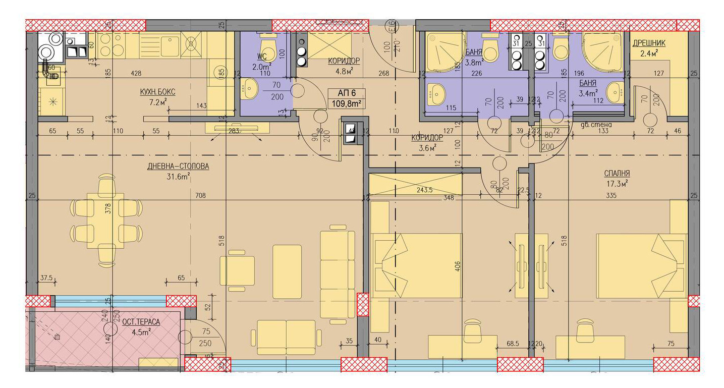 АПАРТАМЕТЪТ се намира на 6-ти етаж, вътрешен и покрит. Архитектите са помислили за всичко, свързано с Вашето удобство! Изложението е югоизточно, а през френските прозорци прониква огромно количество светлина. Холът е с обособен кухненски бокс и остъклена тераса и големина от 43м2! имотът разполага с две спални, една от които с дрешник и три санитарни помещения.