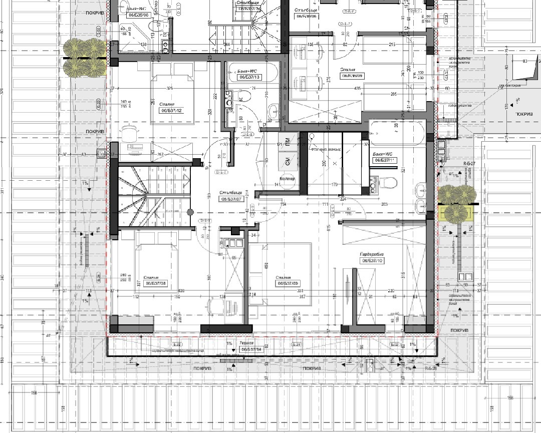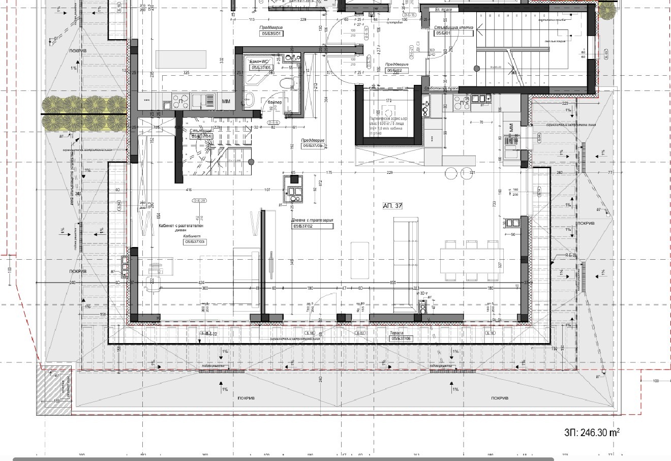 Обща площ: 231,72 м² (202,55 м² застроена площ), Тераси 142,83 м²